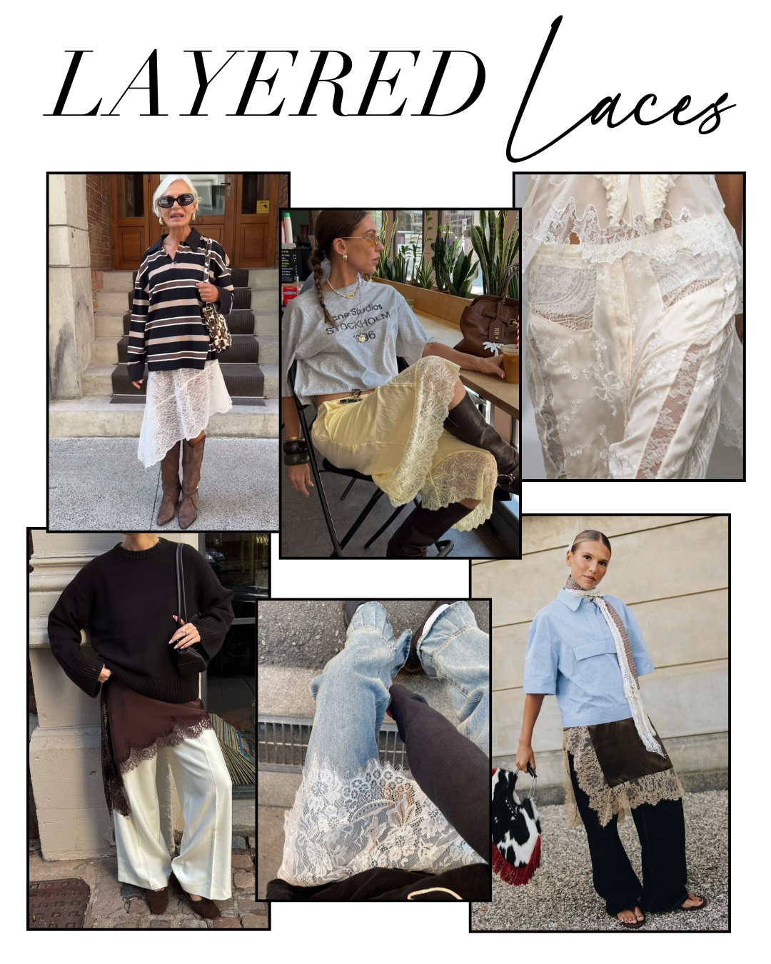 Layered Lace combines minimal silhouettes softened by delicate lace layering. Scandi styling places emphasis on texture and transparency, with a subtle nod to 1990s minimalism. This trend is less about spectacle and more about simplicity - think an asymmetric lace camisole styled over tailored trousers, finished with a light knit or relaxed blazer.