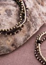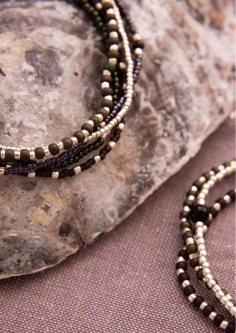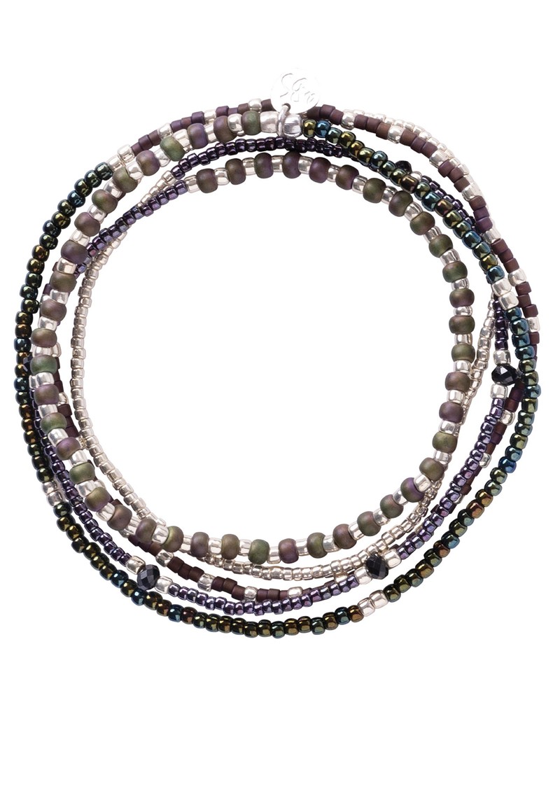 - 5 layer wrap style bracelet featuring glass and silver toned bead detailing with faceted Black Onyx gemstones throughout attached by elastic thread