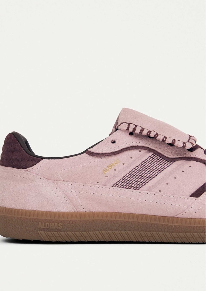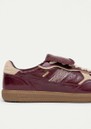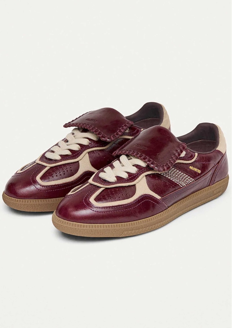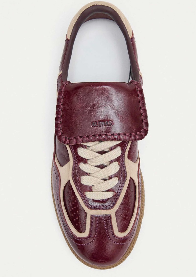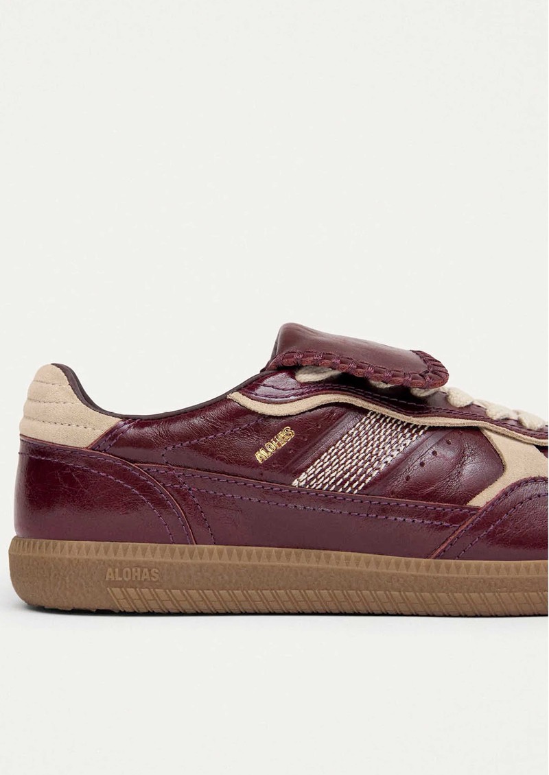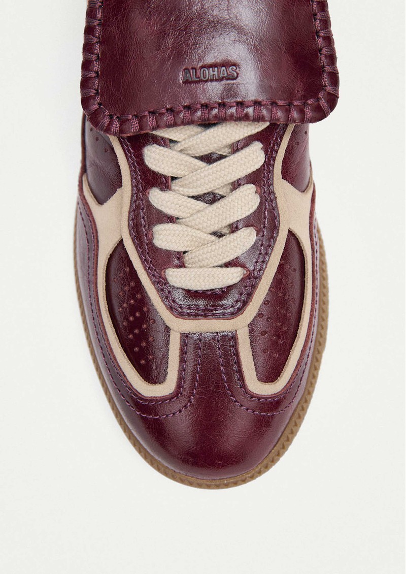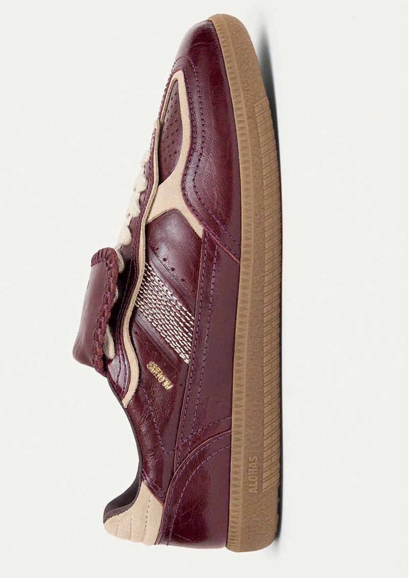 Make a bold statement with the Alohas TB.490 Club in Onix Burgundy, a glossy patent trainer inspired by classic football boots and finished with a striking fold-over tongue. Deep burgundy leather and contrast cream trims elevate this low-top design with standout luxury and everyday wearability.