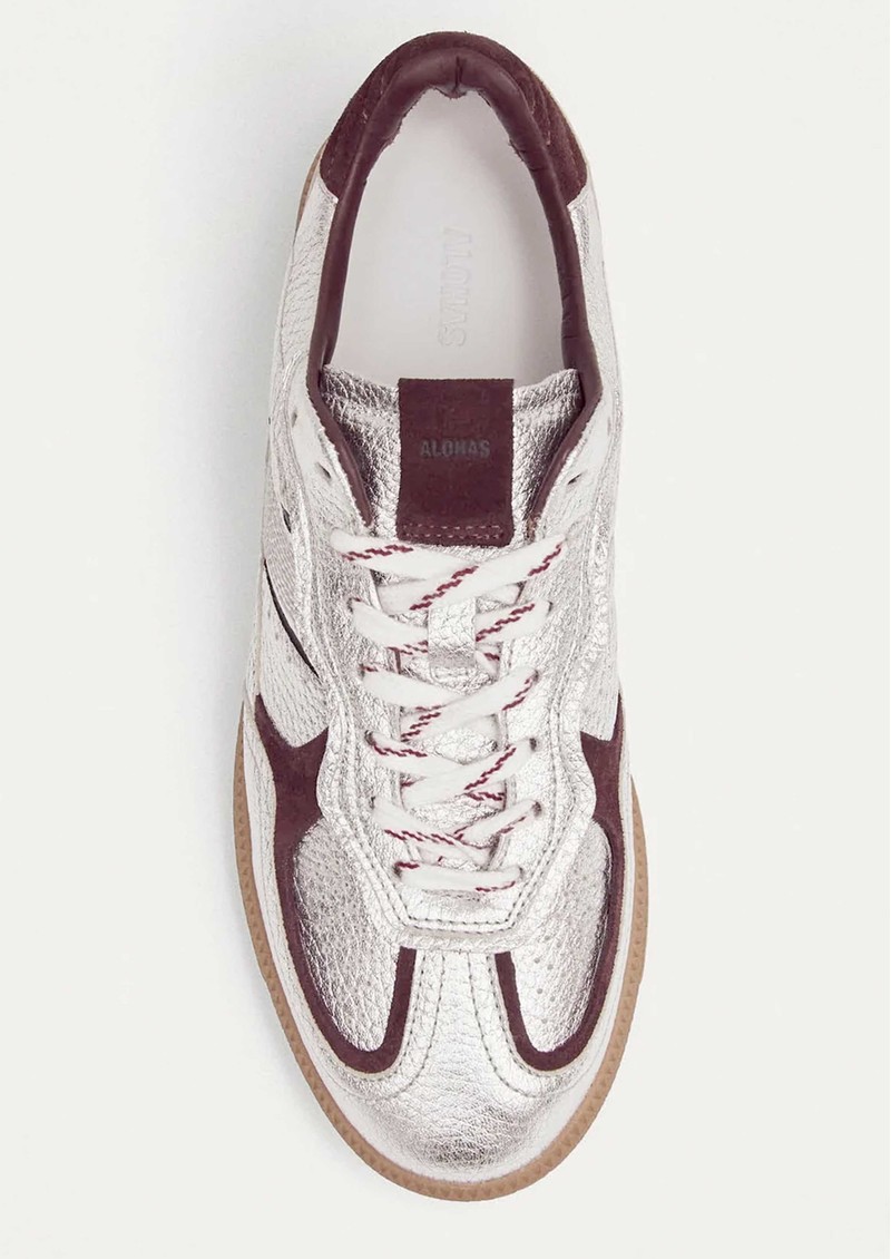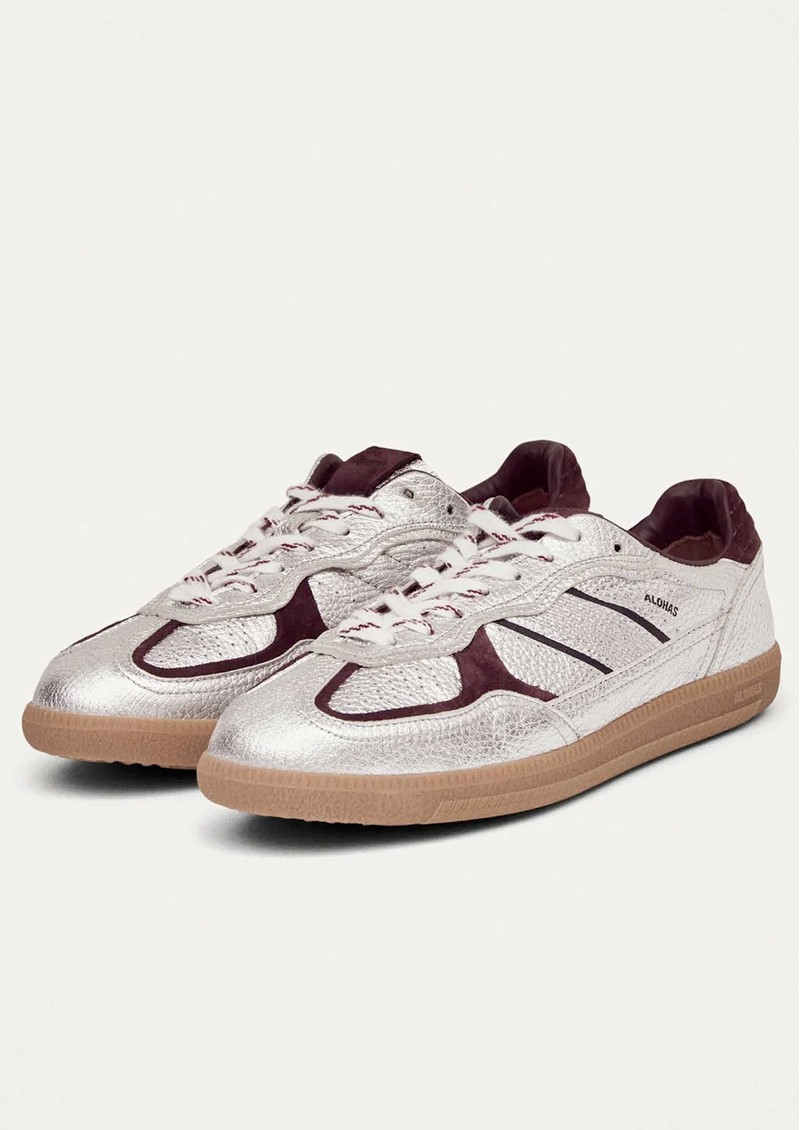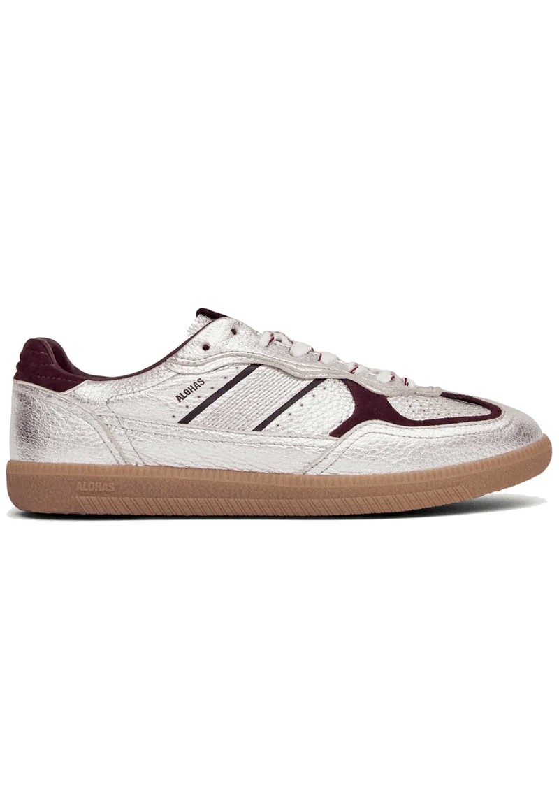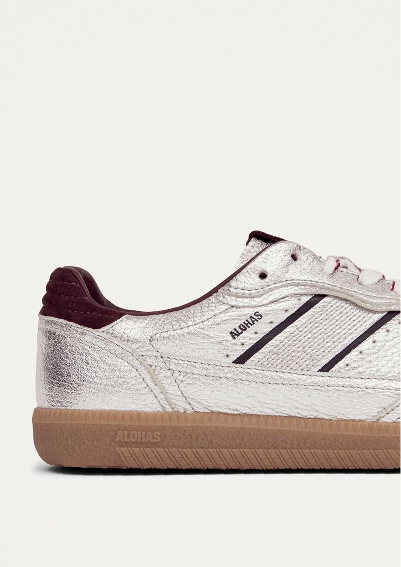 Shimmer in style with the Alohas TB.490 Grain Shimmer, a silver grain-textured trainer elevated with gleaming tones and rich burgundy trims. Finished with striped cream laces and a classic low-top silhouette, it delivers standout shine, premium craftsmanship and everyday versatility.