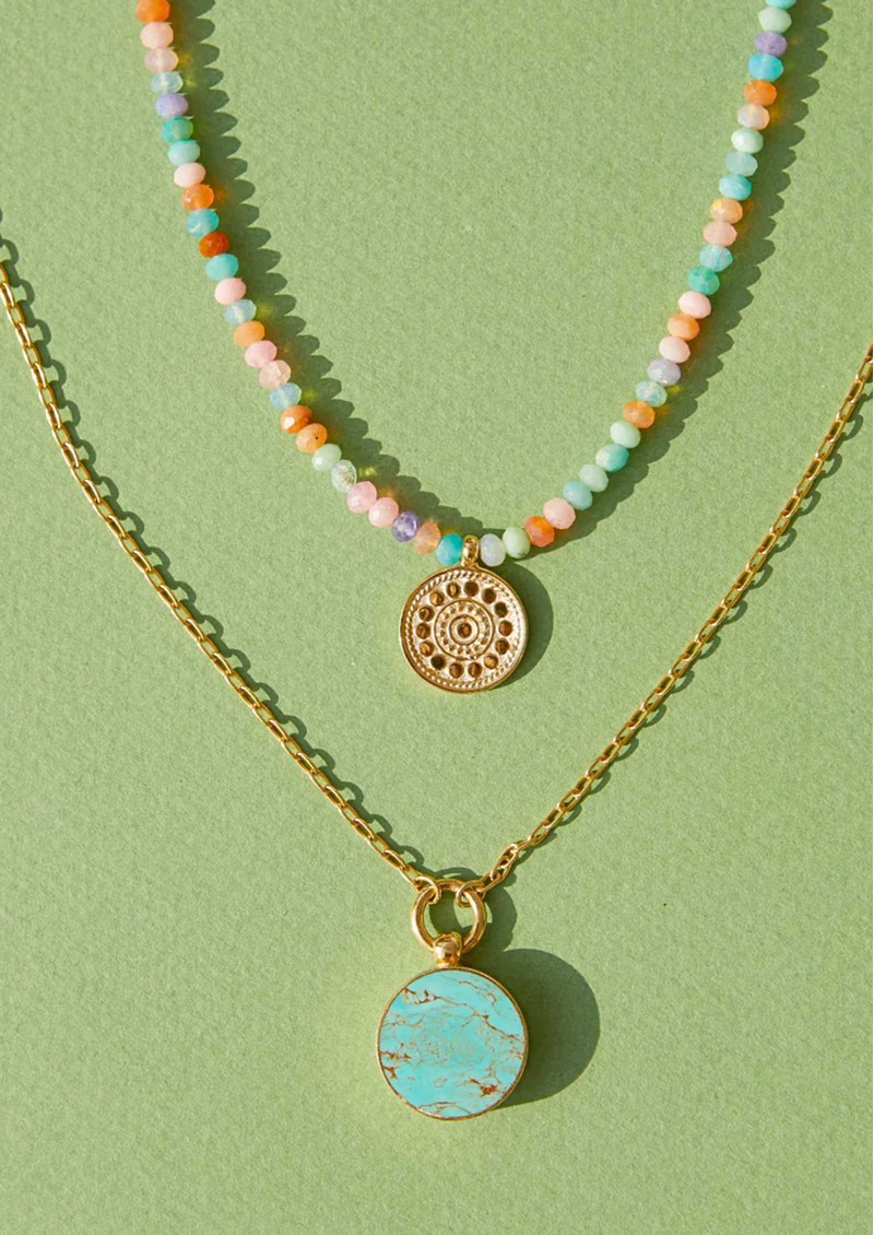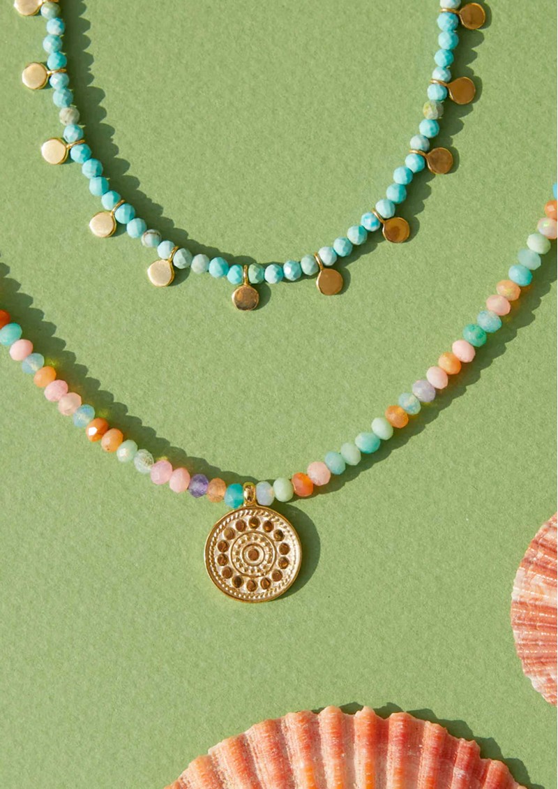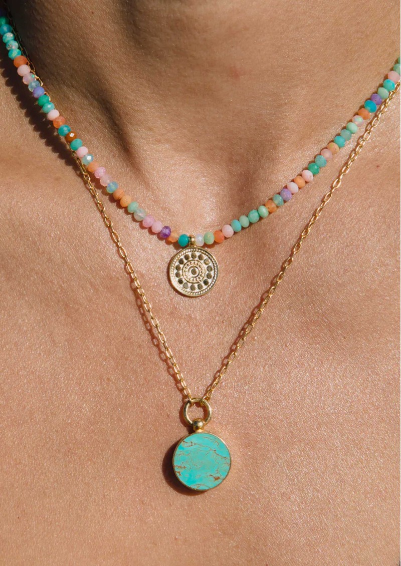 A colourful, easy-to-wear layer, the Anna Beck Candy Mini Circle Drop Necklace mixes multicolour opal beads with a delicate gold circle pendant for a playful yet timeless feel. Handcrafted in Bali, it brings soft colour and light movement that works just as well layered as it does worn solo.