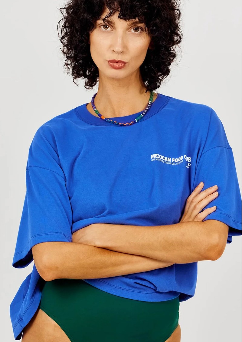 The A.P (Arsène & Les Pipelettes) Mexican Food T-shirt is made from certified organic cotton jersey and features a relaxed, boxy fit for comfort. It has a round neckline with ribbed trim, short sleeves, “Mexican Food Club” prints on the chest and back, a blue polka dot label at the side seam, and comes in responsible packaging.