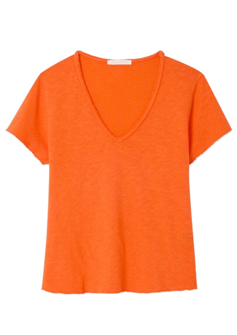 Introducing the American Vintage Sonoma Tee for the new season in a rich Gaspacho hue. Crafted from 100% cotton, this classic-fit tee features a V-ribbed neckline, subtle flecked texture, and raw-edge detailing for a relaxed, effortlessly casual vibe.