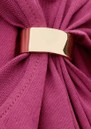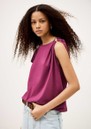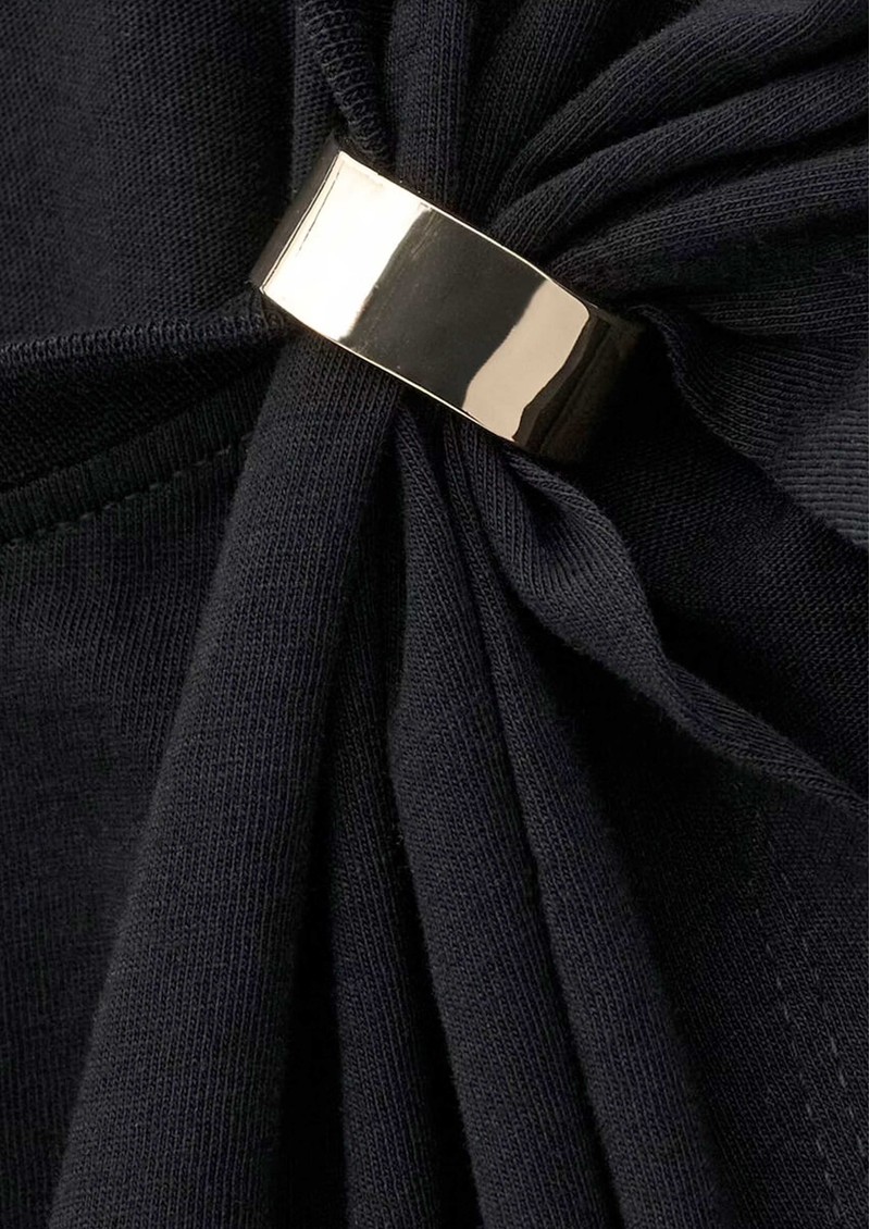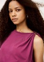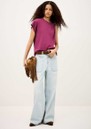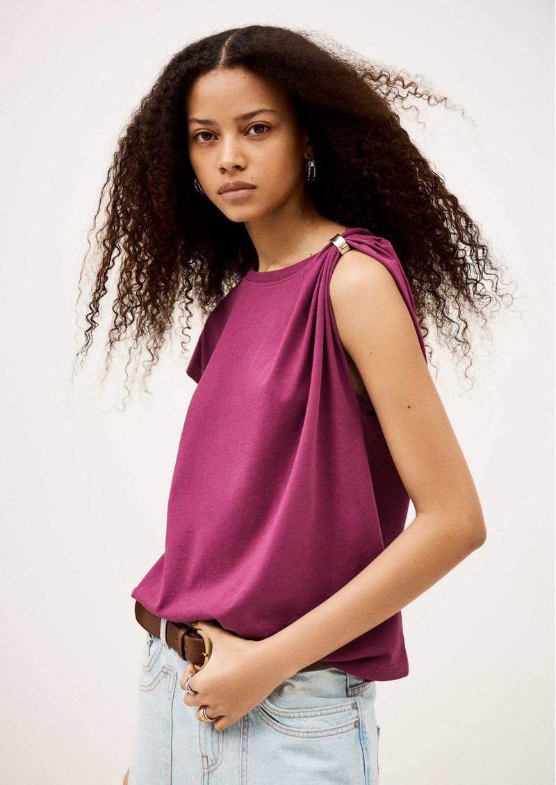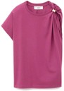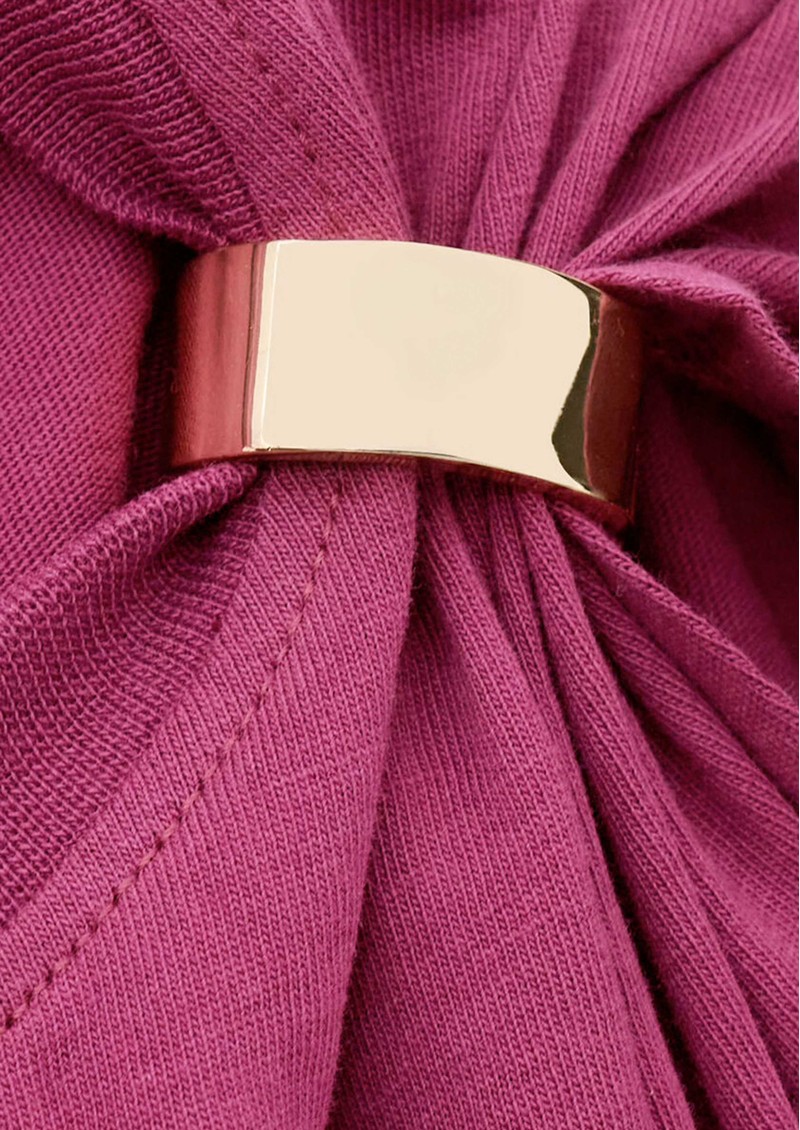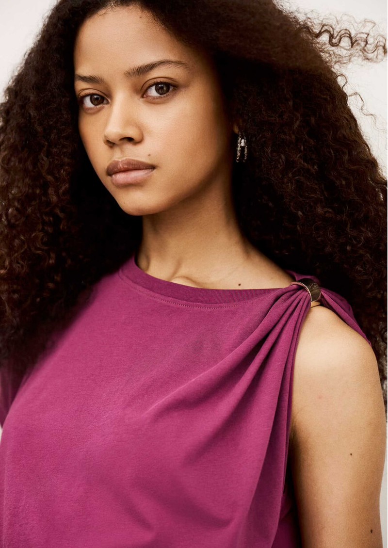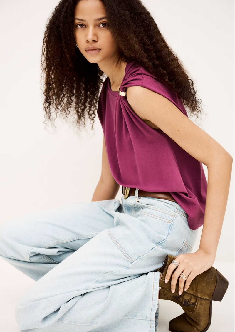 The Ba&sh Allia T-Shirt in Aubergine is crafted from organic cotton, featuring a slim fit, short sleeves, crew neckline, removable metal shoulder detail, and asymmetrical ruffles for a subtle, stylish twist.