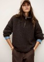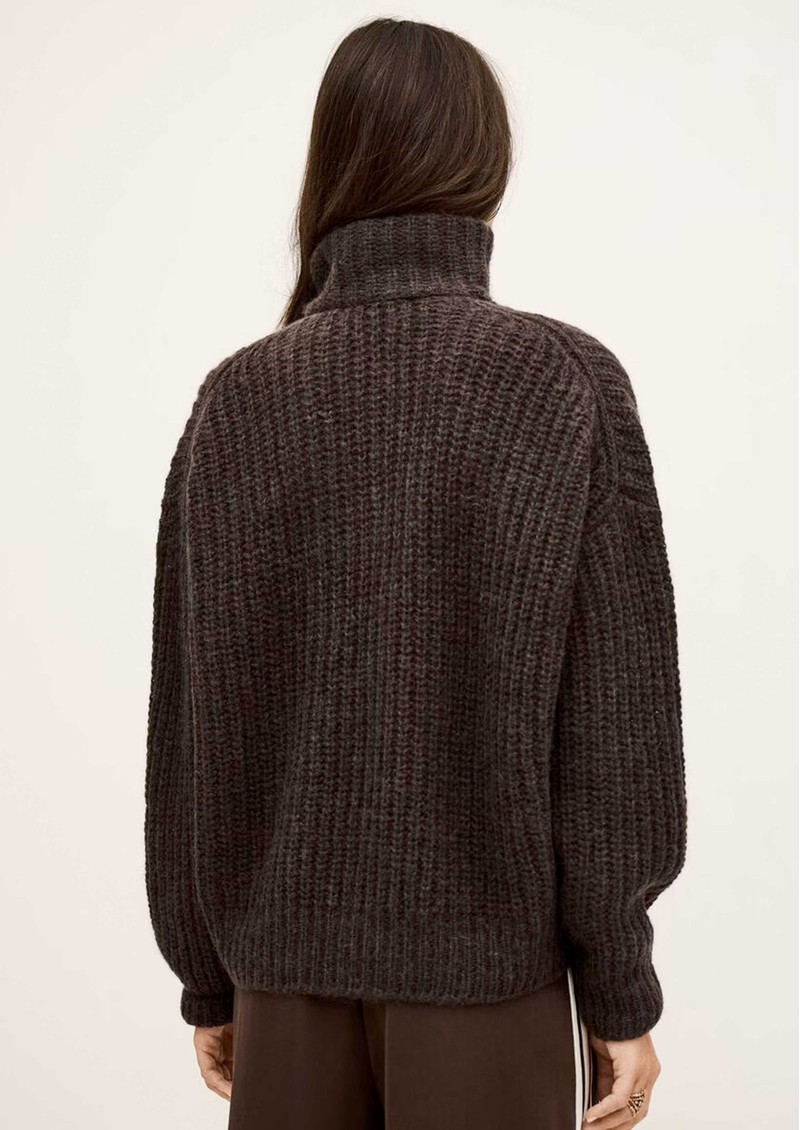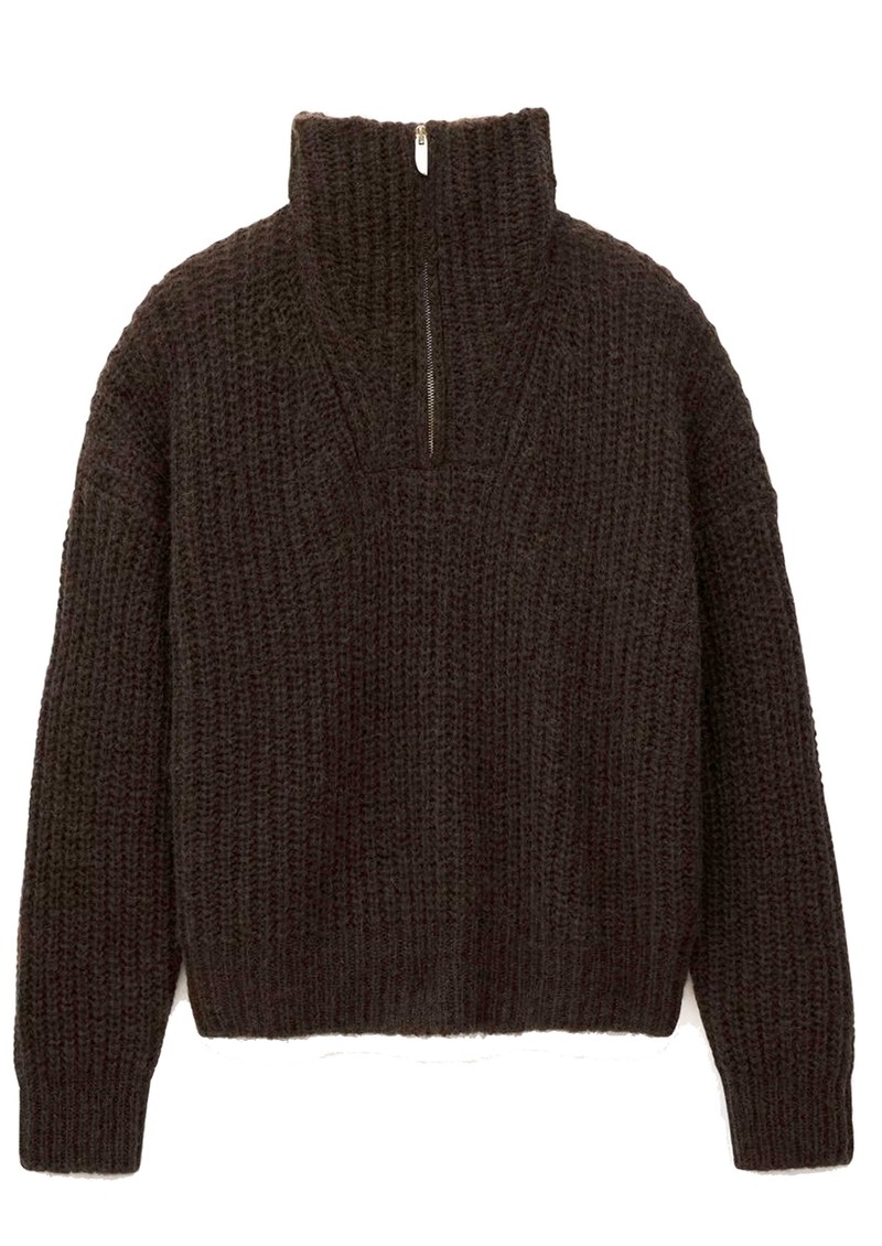 The Ba&sh Beltane Knit Jumper in chocolate is a straight-fit, luxurious jumper crafted in Italy, perfect for casual, elevated layering. Featuring a fold-over zip collar, drop armholes, long sleeves, and wide-ribbed material, it combines comfort with understated style.