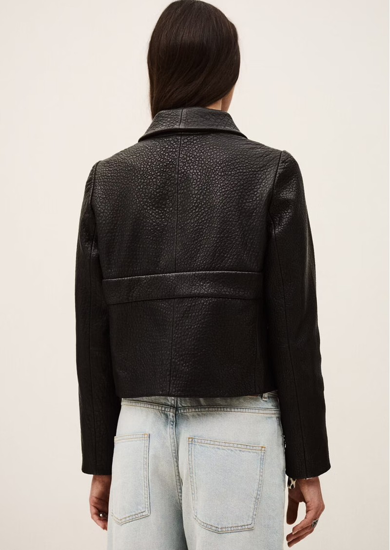 Say hello to the Ba&sh Borfeo Leather Jacket, designed in a stunning slightly textured black lambs leather. This boxy, cropped style features button detailing at the front and a subtle tonal panel across the front. Other features include: