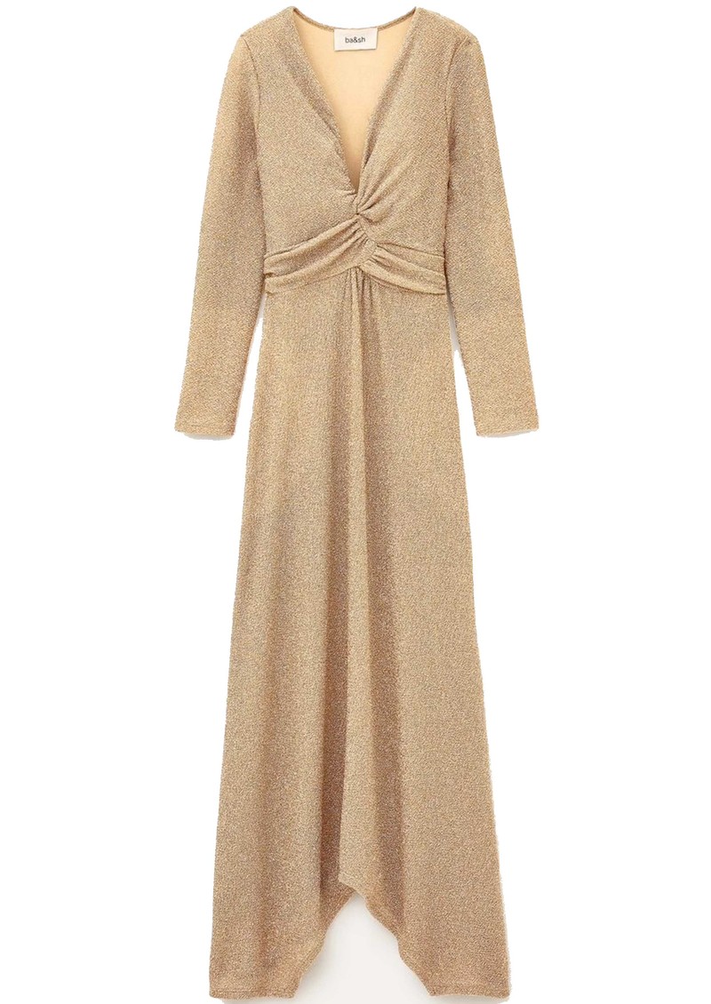 The Ba&sh Brady V-neck maxi dress combines a flattering fitted waist with a sparkling, glittery finish for a show-stopping look. Its flowing godet skirt and twisted knot detail create movement and effortless style from every angle.