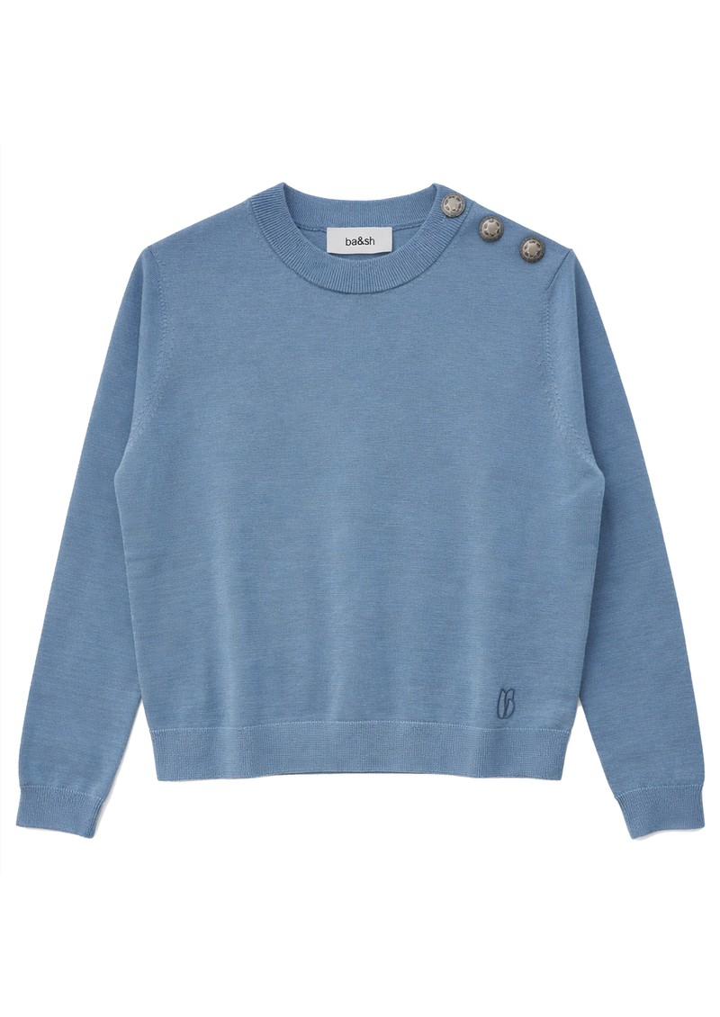 The Ba&Sh Byleil Jumper in Orage is made from 100% wool, offering warmth and luxe softness in a bold, standout hue. Designed with a crew neck, regular fit, ribbed trims, gold-tone shoulder buttons, and a subtle embroidered Ba&sh emblem, it’s a stylish layering essential.