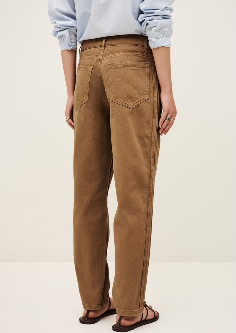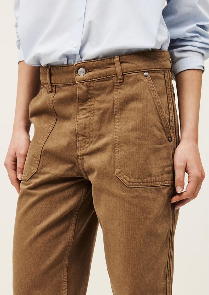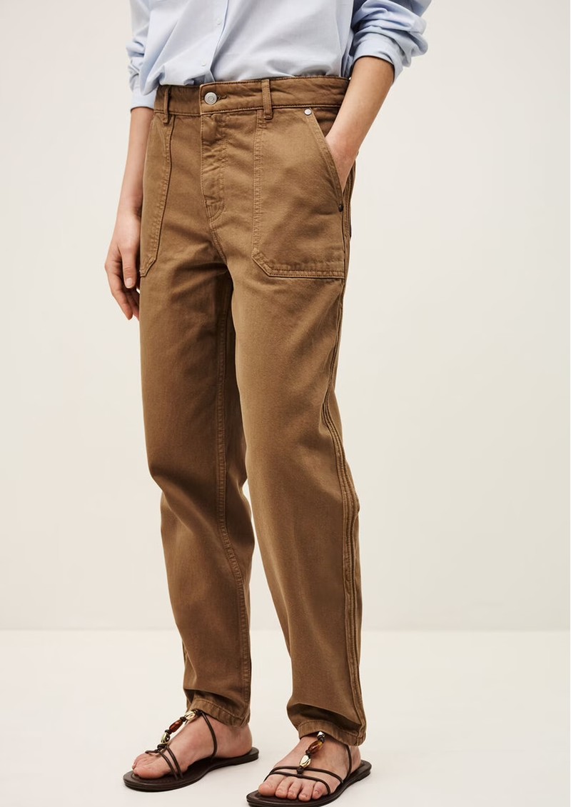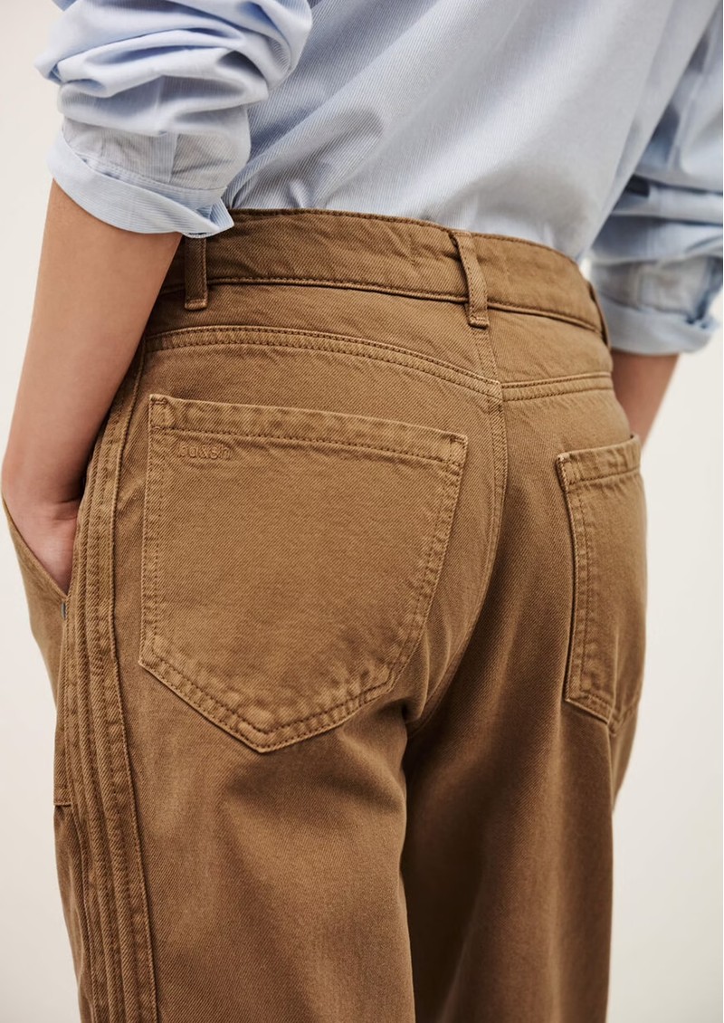 The Ba&sh Cali pants in camel feature a tapered carrot-leg silhouette with a relaxed yet structured shape, finished with front tie fastening and textured detailing running down the leg for subtle definition. Designed with a mix of utility-inspired pockets-including double front pockets, large patch pockets with side access and back patch pockets-they offer both style and function in a modern everyday trouser.