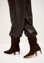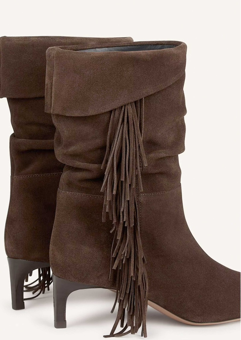 The Ba&sh Cardi boots bring a touch of Western-inspired charm in rich chocolate brown suede. Designed with a relaxed, slouchy shape and foldover top, they feature soft fringe detailing along the sides, a gently pointed toe, and a slim, comfortable heel-perfect for effortless everyday style.