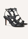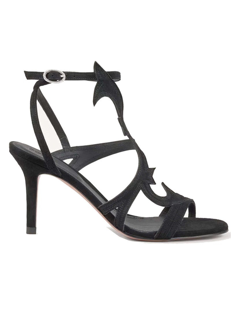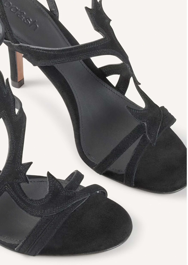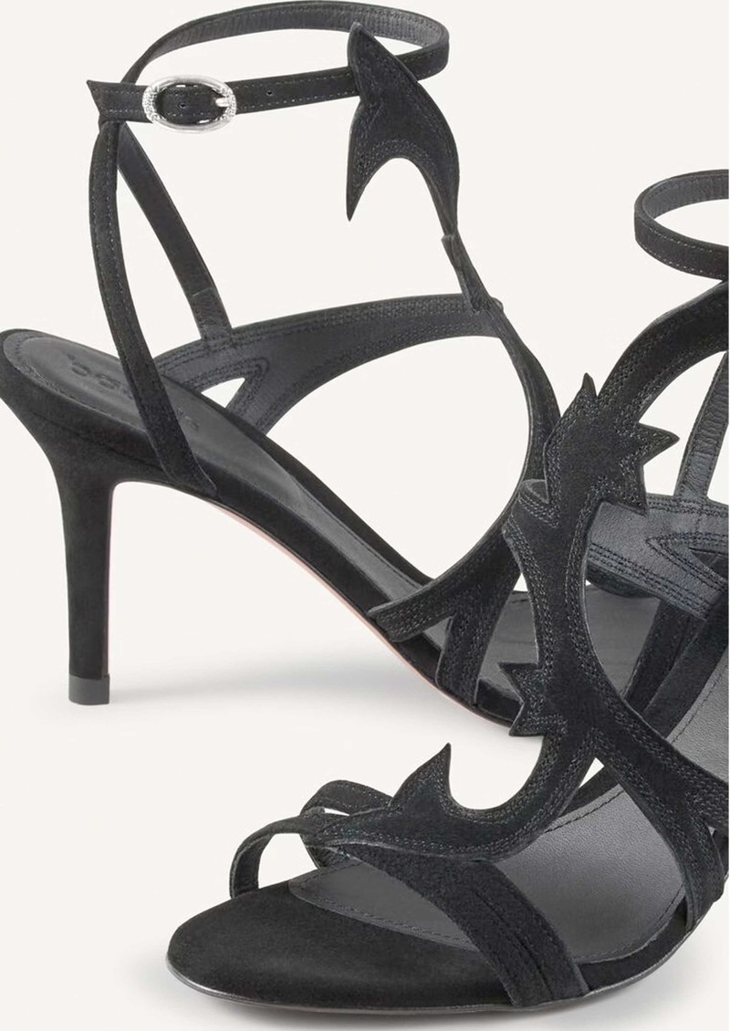 The Ba&sh Cate sandals are elegant black heeled sandals crafted from soft suede leather, featuring strappy detailing, an adjustable ankle strap, and a striking cut-out design for a modern, sophisticated finish.