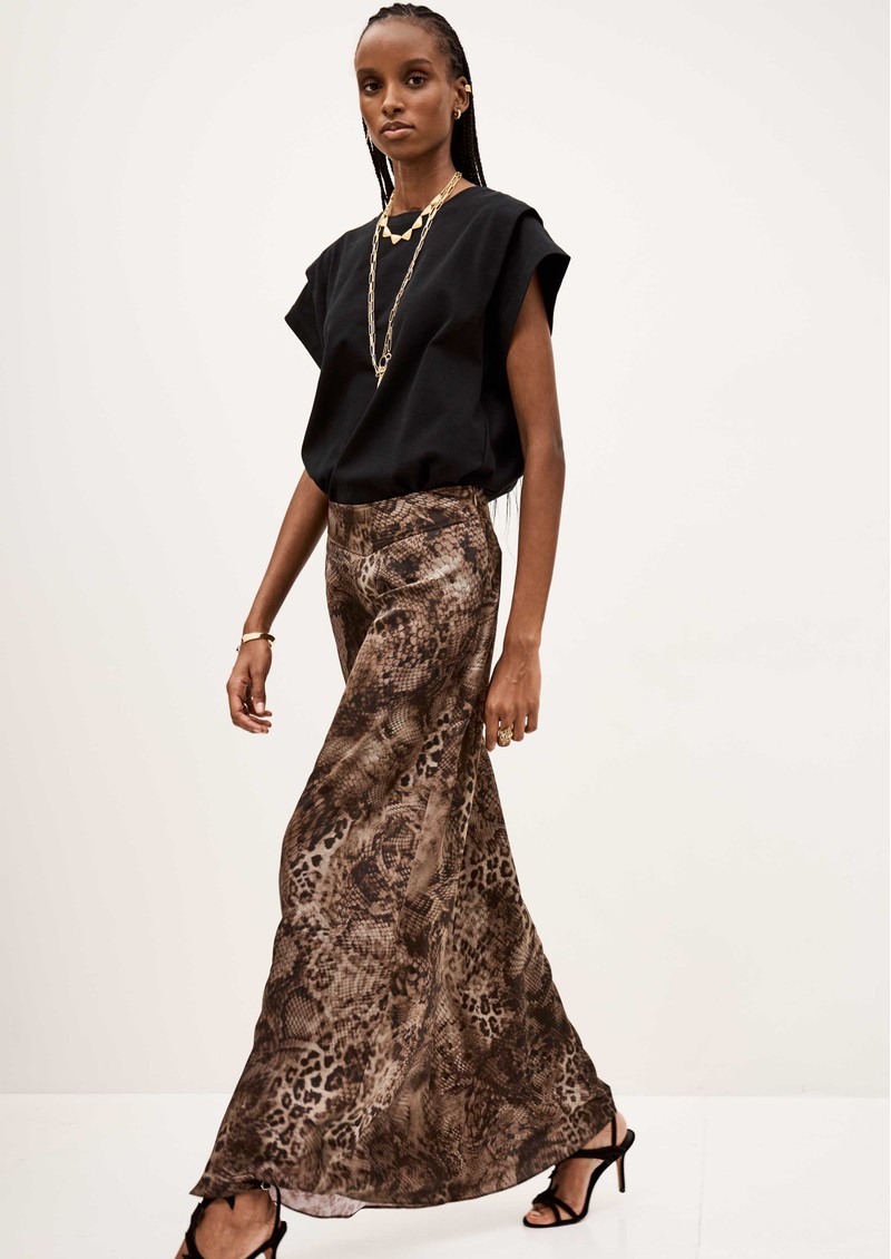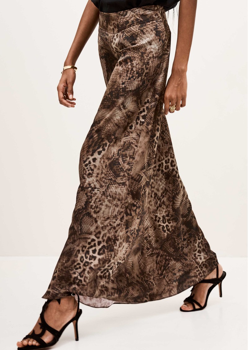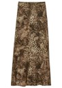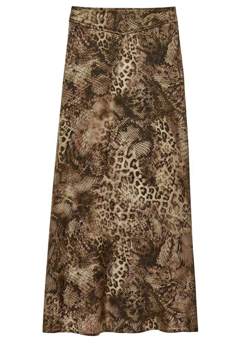 The Ba&sh Ciria skirt is a striking flowing maxi style crafted from recycled polyester, designed with an all-over abstract animal print in a rich warm kaki hue. Effortlessly versatile, it can be dressed up or down for any occasion.