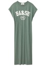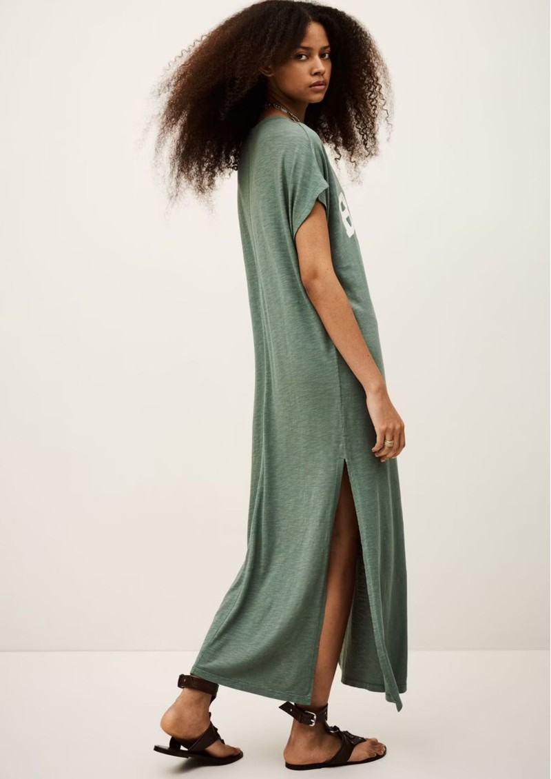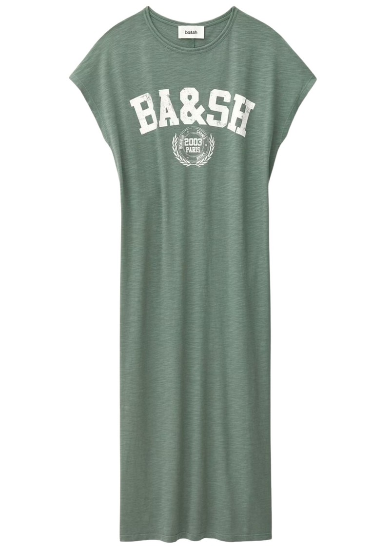 The Ba&sh Civia T-Shirt Dress in Kaki is crafted from an organic cotton and modal blend, featuring a scoop neckline, varsity-inspired logo motif, straight loose fit, side slits, and a middle back seam with flatlock stitching for effortless, sustainable style.