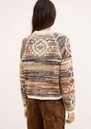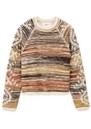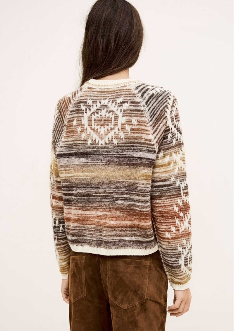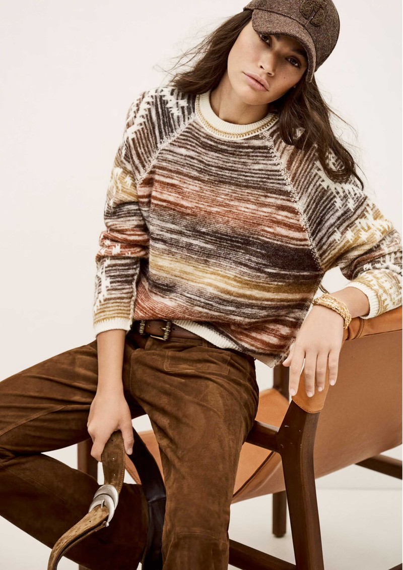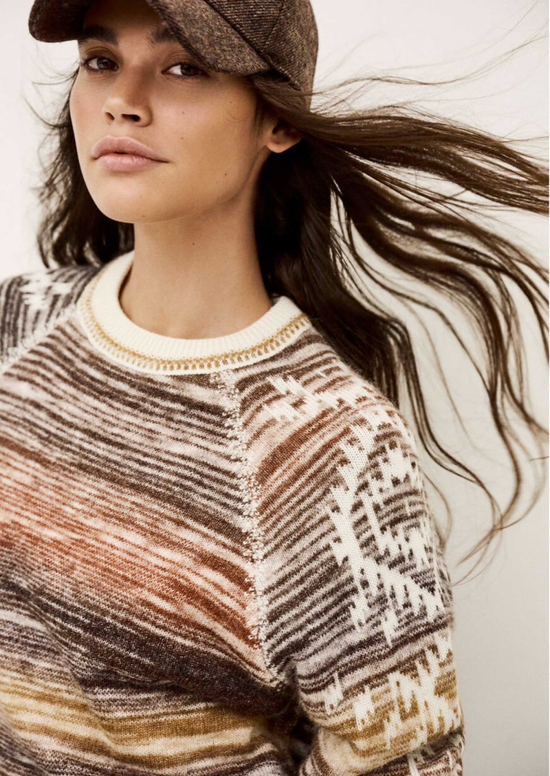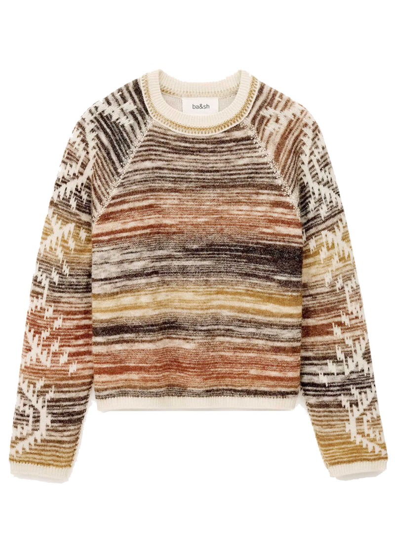 The Ba&sh Clode jumper is a cosy knit crafted from a luxurious wool blend, featuring tonal brown and beige shades. Designed with a rounded neckline, long sleeves, and a geometric pattern across the arms and back, it brings a warm, modern edge to your everyday wardrobe.