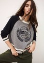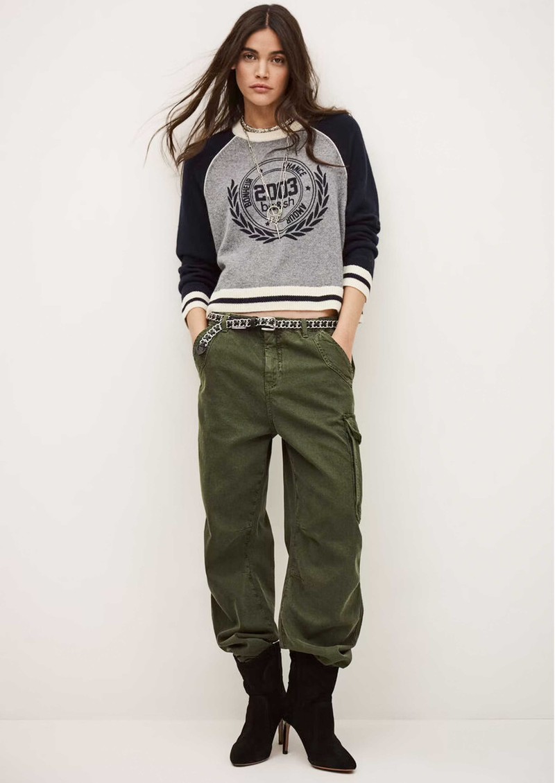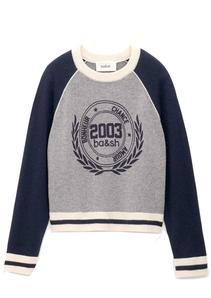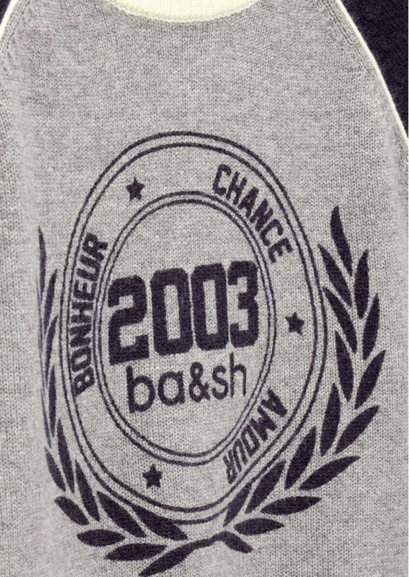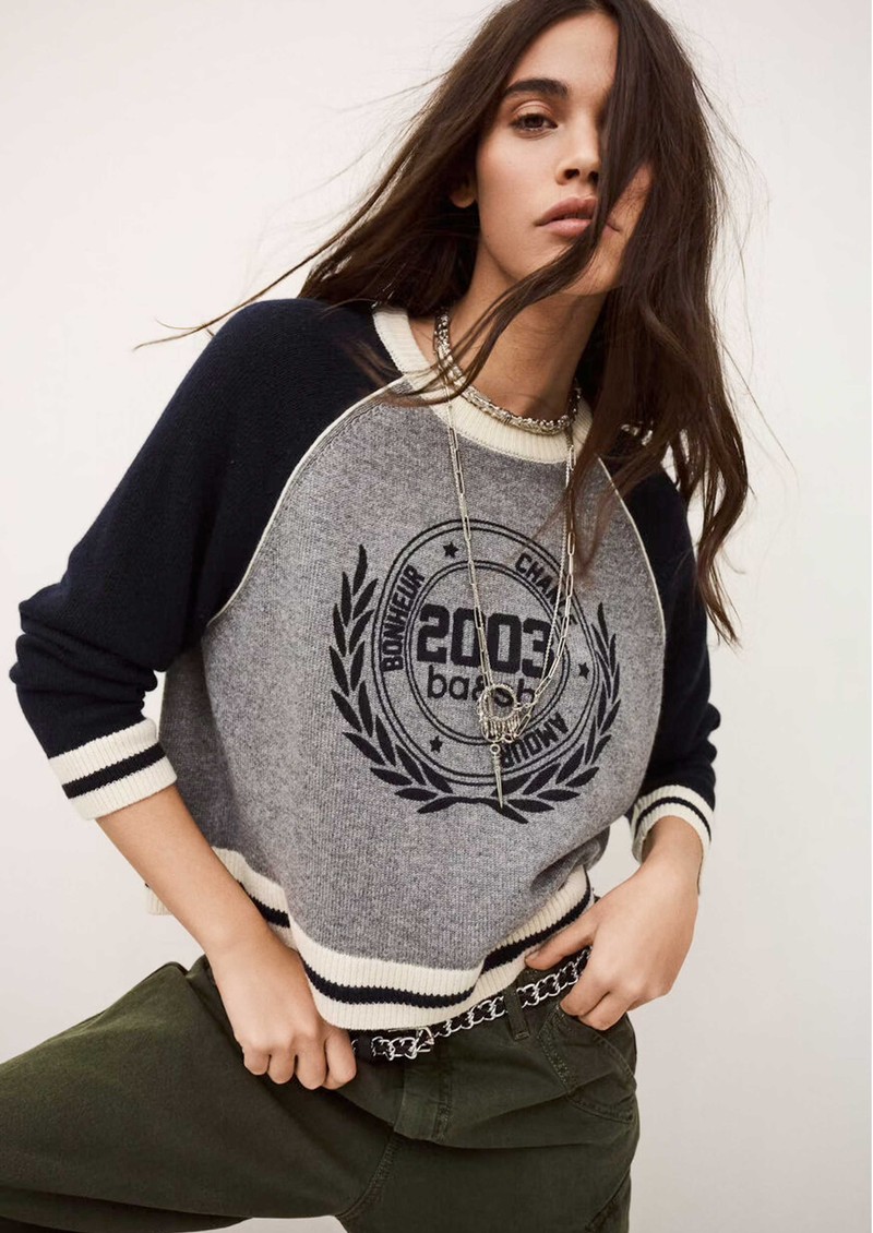 Crafted from 60% recycled cashmere and 40% pure cashmere, the Ba&sh Collette Jumper blends sustainability with sporty style. Featuring a central varsity-inspired graphic, a classic crew neckline, long sleeves, and a relaxed fit, it comes in a sophisticated grey/ecru and navy colourway.