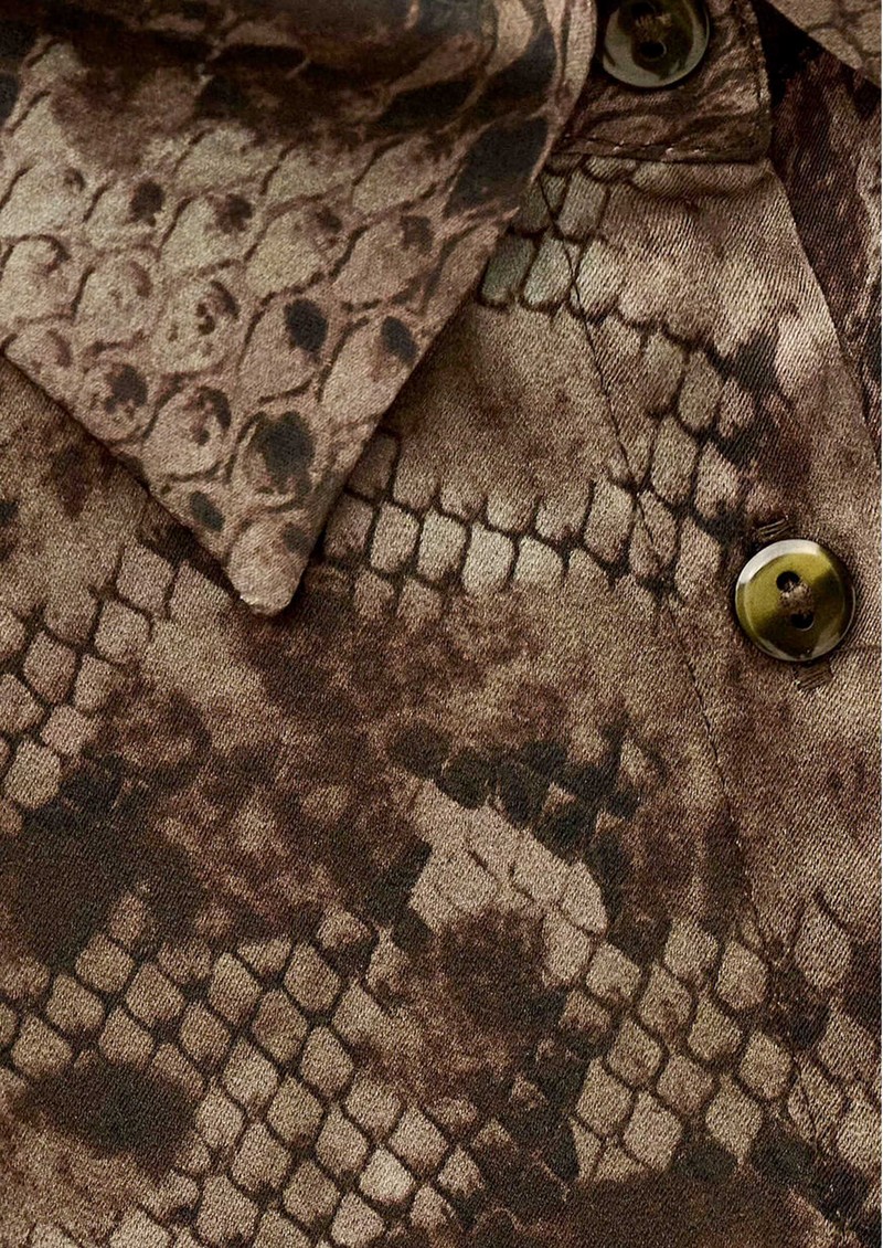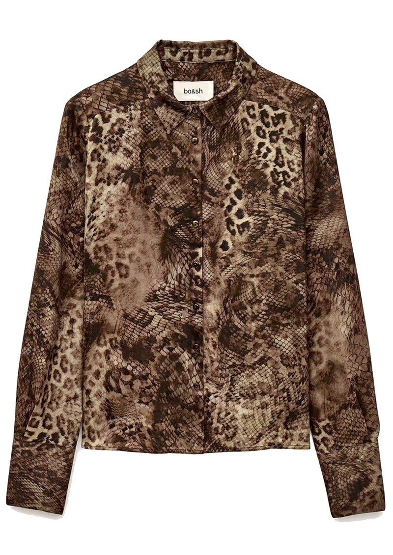 The Ba&Sh Cornelia Shirt in kaki is crafted from recycled polyester, combining sustainability with standout style. Featuring an all-over abstract snake print in tonal kaki, a regular fit, classic pointed collar, long sleeves, and a central button closure, it’s perfect for effortless day-to-night dressing.