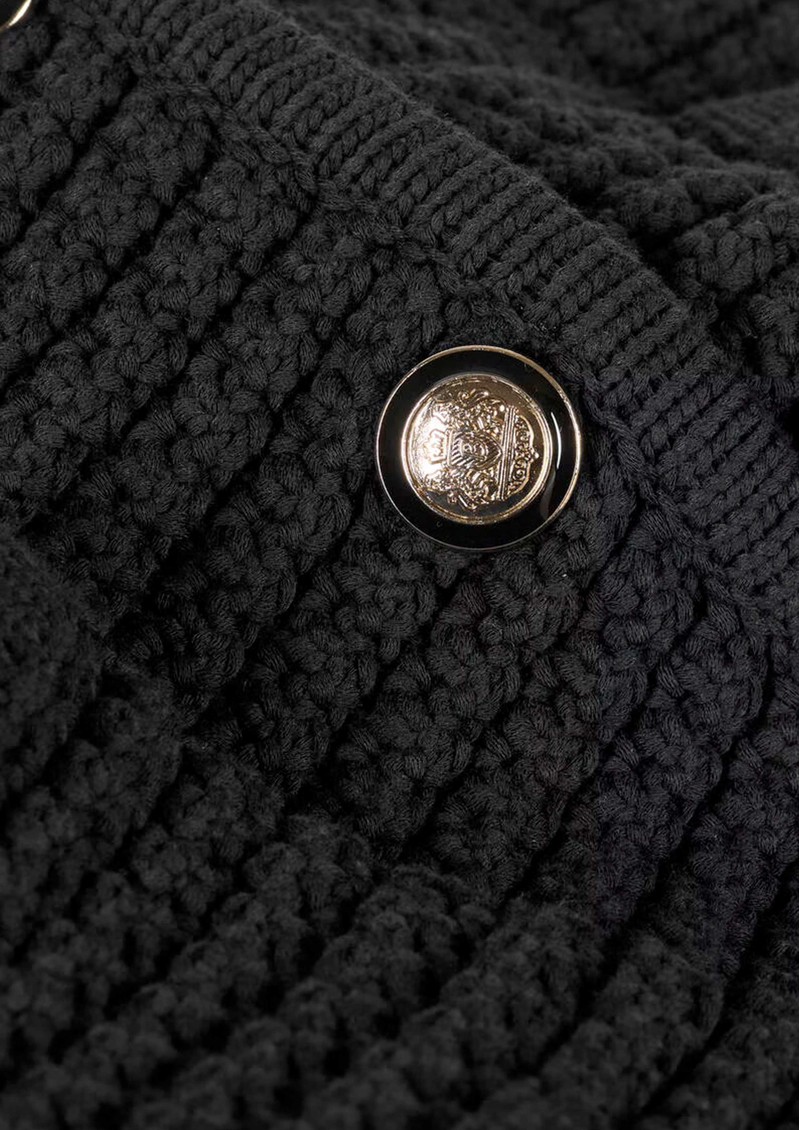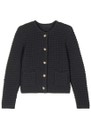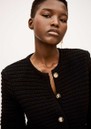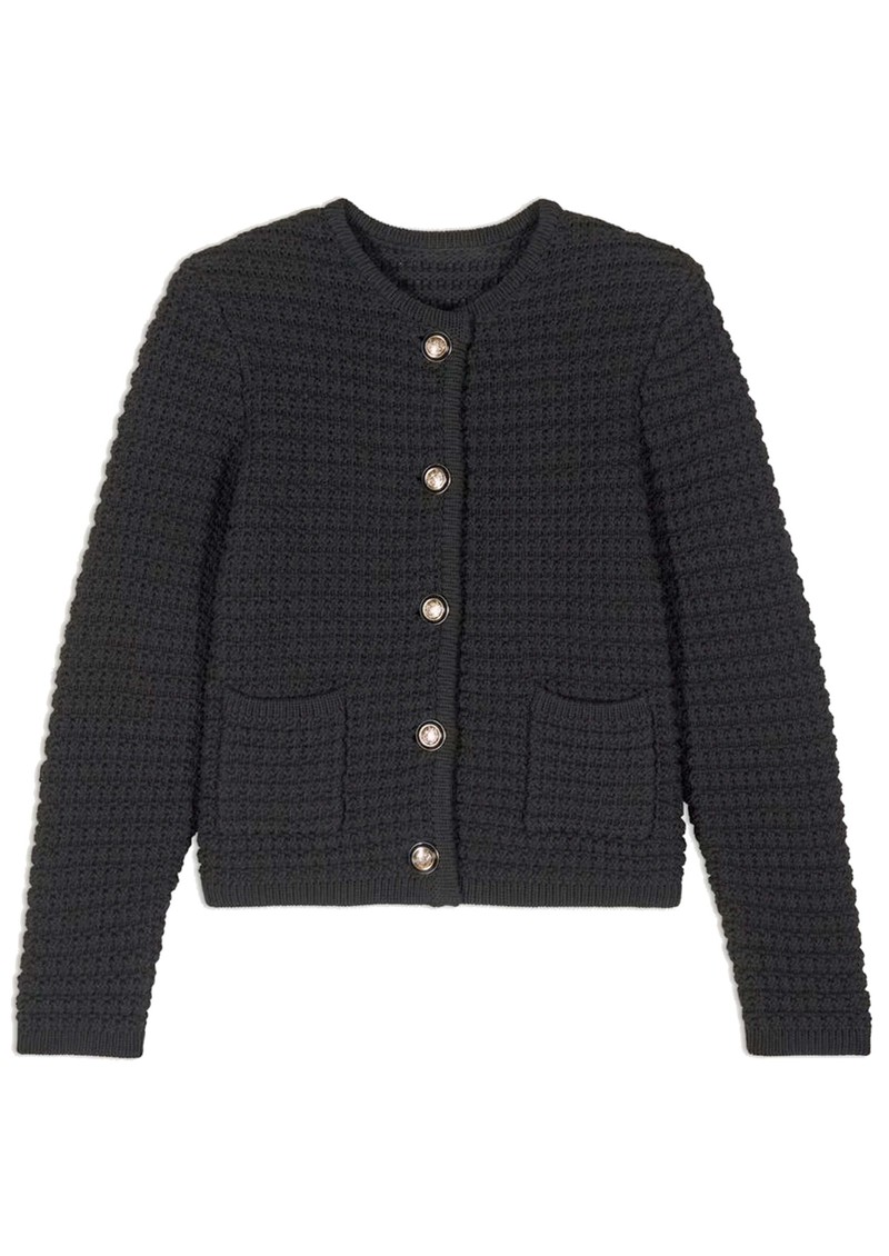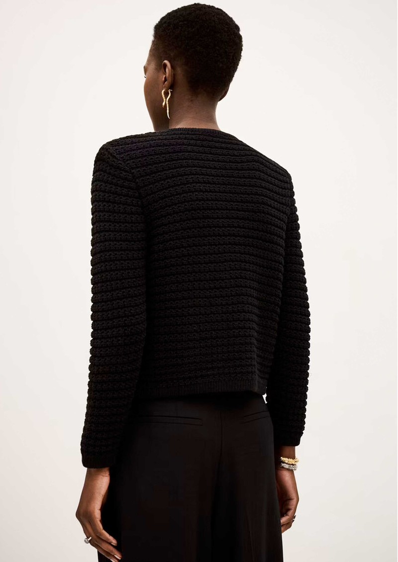 The Ba&sh Gaspard cardigan in black combines the ease of a jacket with the elegance of a cropped, long-sleeved knit. Featuring a round collar, eye-catching textured ottoman stitch, black-and-gold buttons, and handy pockets, it elevates both casual and smart looks effortlessly.