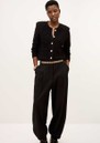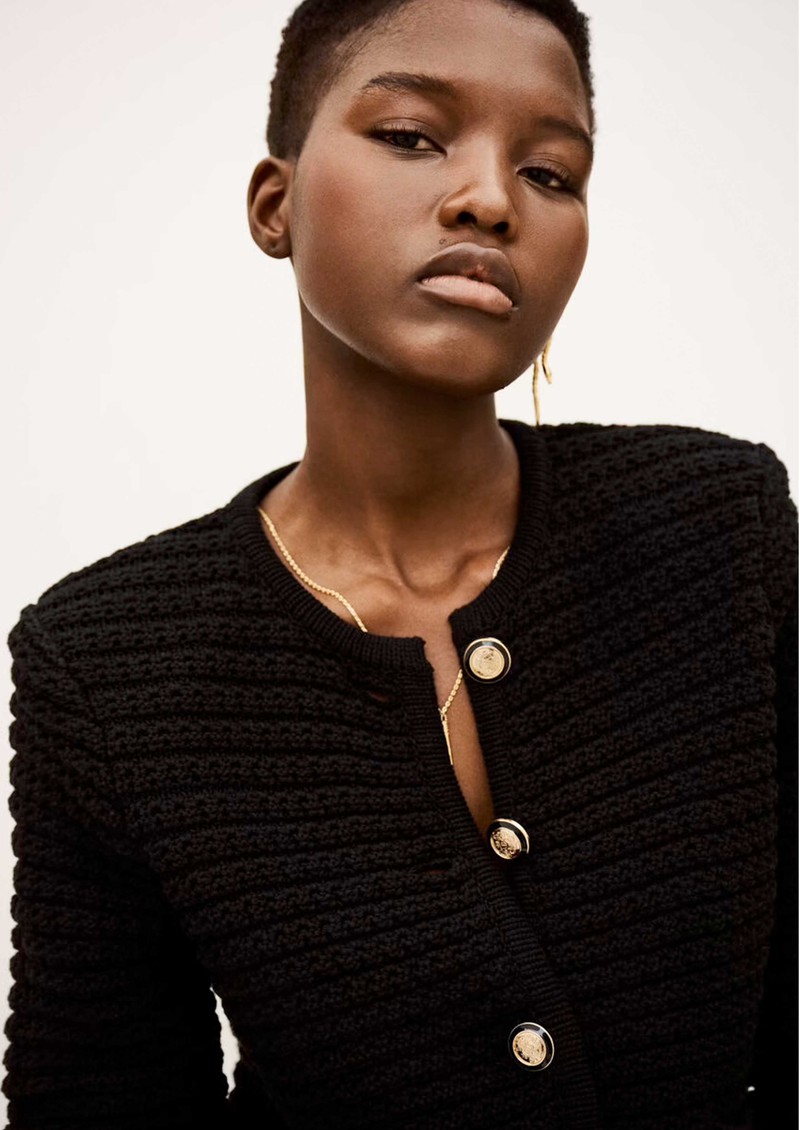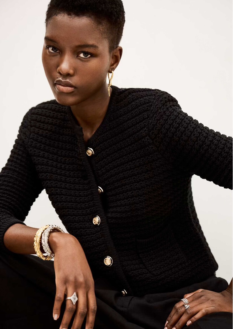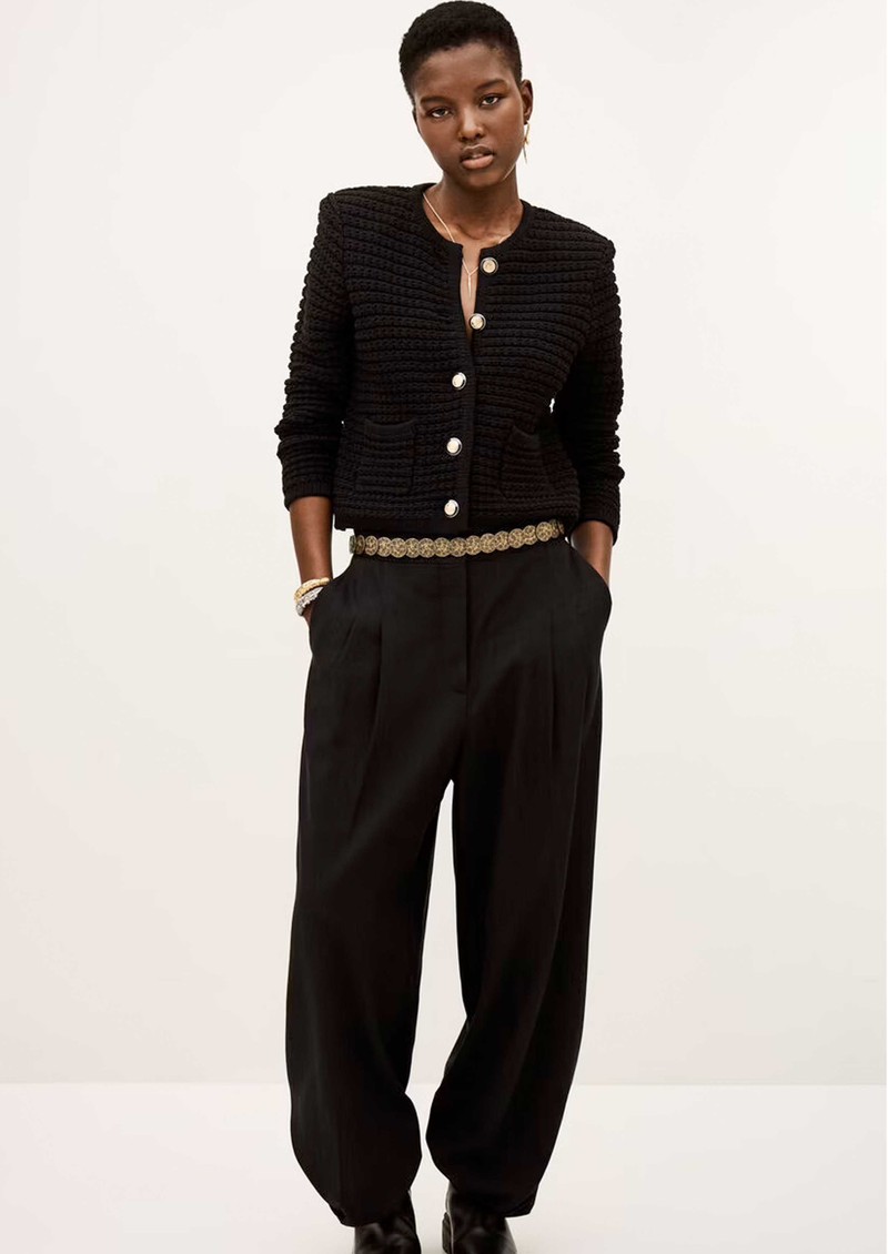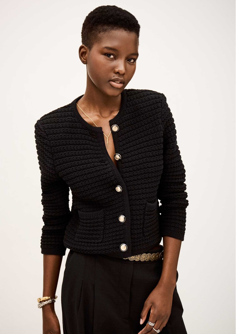The Ba&sh Gaspard cardigan in black combines the ease of a jacket with the elegance of a cropped, long-sleeved knit. Featuring a round collar, eye-catching textured ottoman stitch, black-and-gold buttons, and handy pockets, it elevates both casual and smart looks effortlessly.