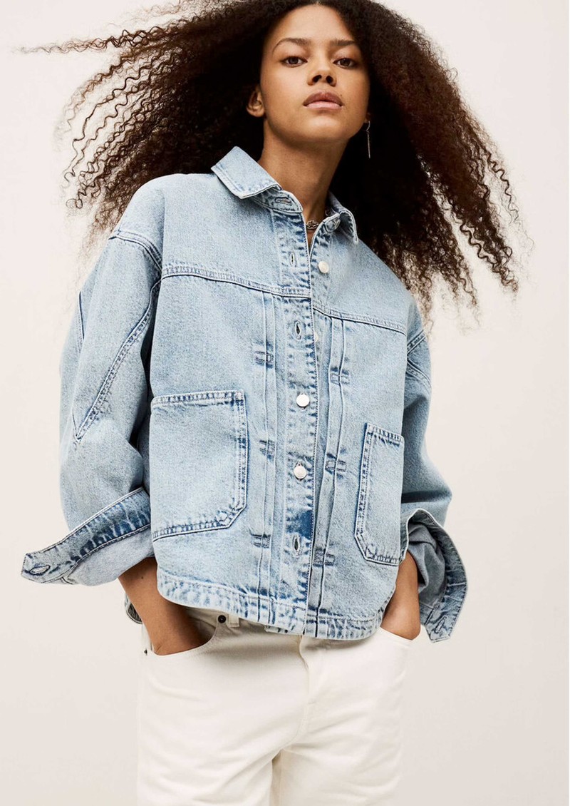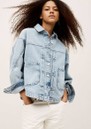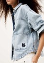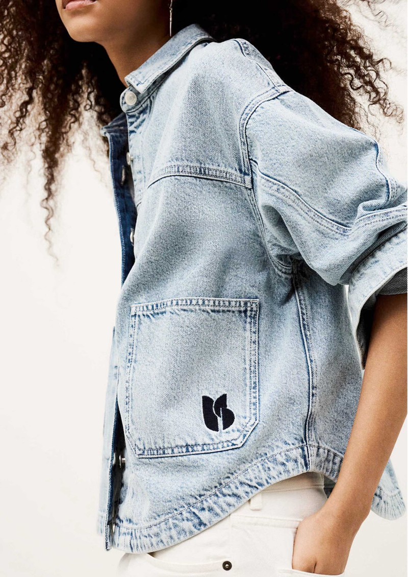The Ba&sh Juno Denim Jacket in blue jeans is an oversized shirt-style jacket crafted from cotton sourced from organic farming. It features a classic collar, front patch pockets, top-stitched seams, and visible metal buttons, finished with an embroidered logo on the front pocket for a subtle designer touch.