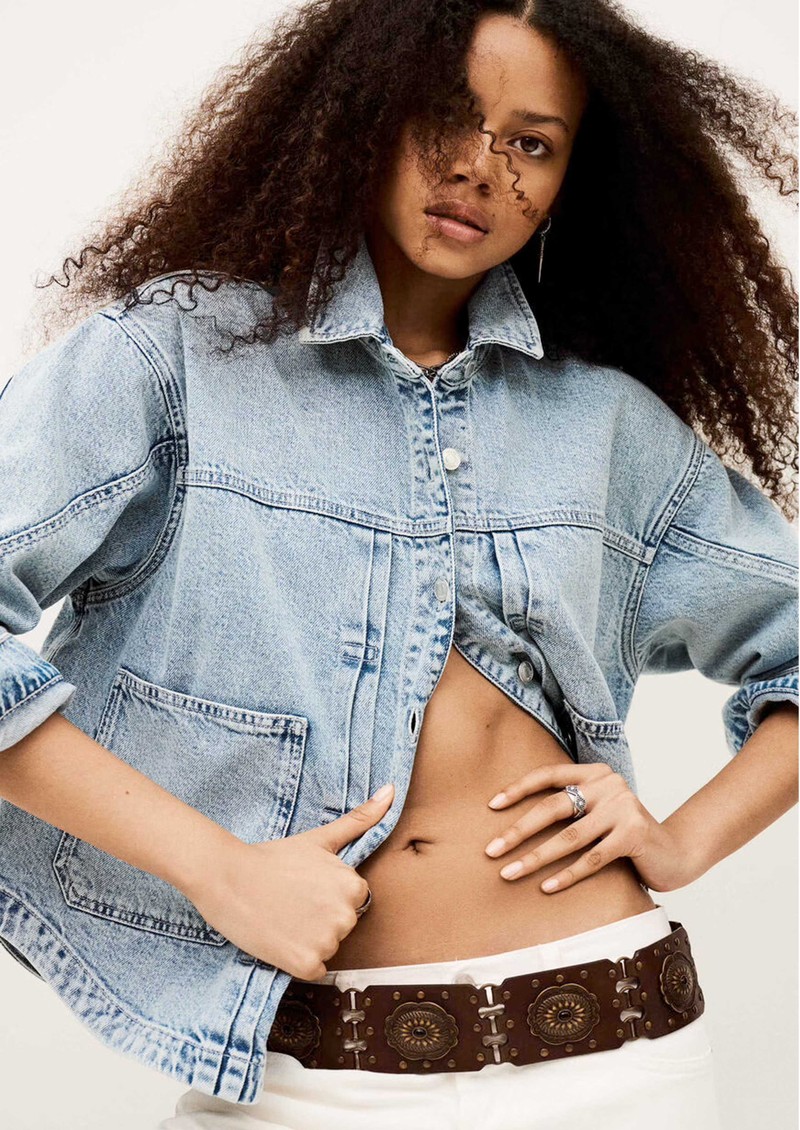 Style your Ba&sh Juno Denim Jacket with a matching Ba&sh top, pairing it with Paige jeans and Ba&sh boots for a polished, effortless look.