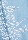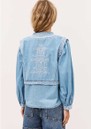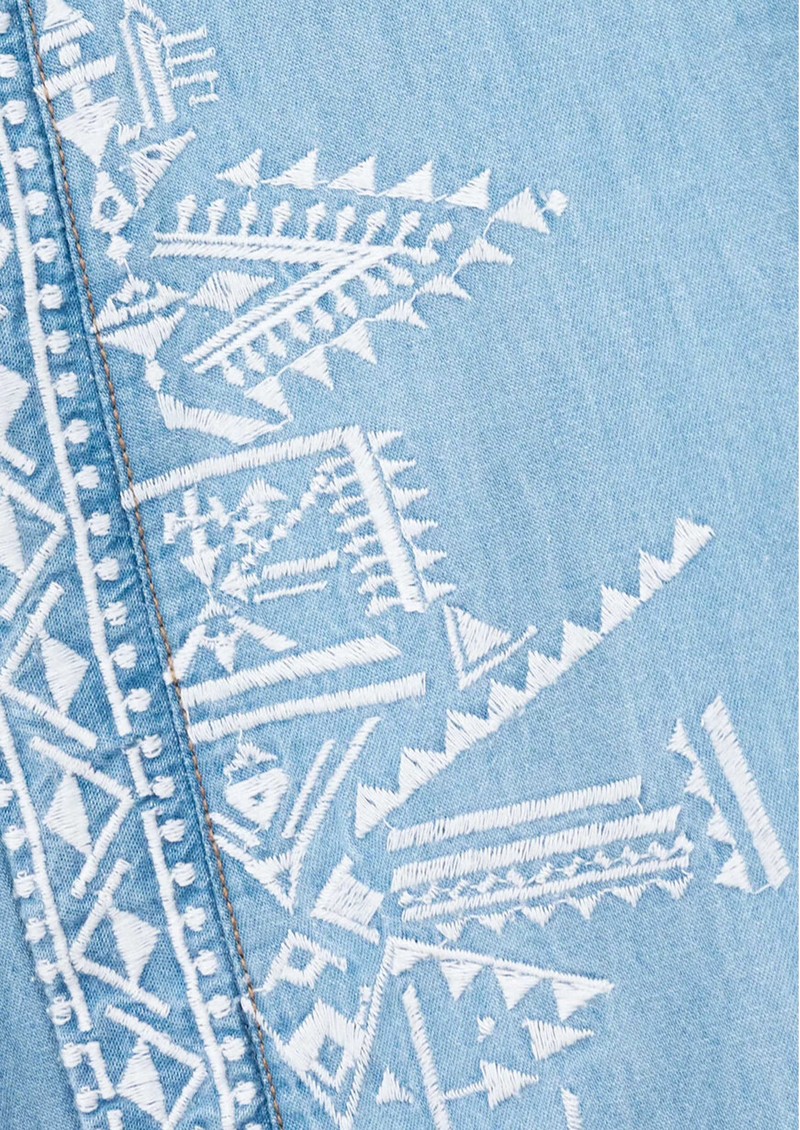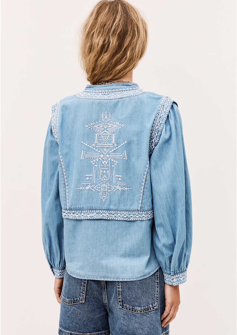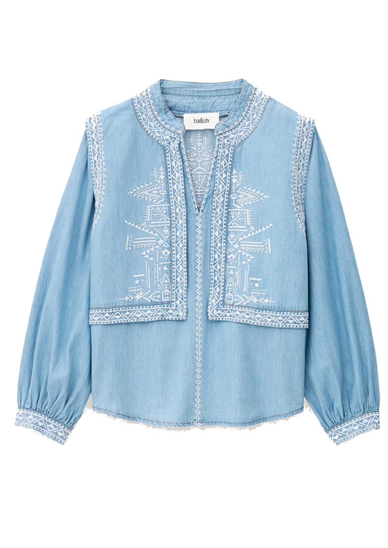 The Ba&sh Laura Embroidered Blouse in Light Blue is a stylish, denim-effect chambray top with a unique two-in-one illusion design. It features a sleeveless cardigan overlay, slightly puffed sleeves, and a straight cut, crafted from 100% cotton for a comfortable, modern fit.