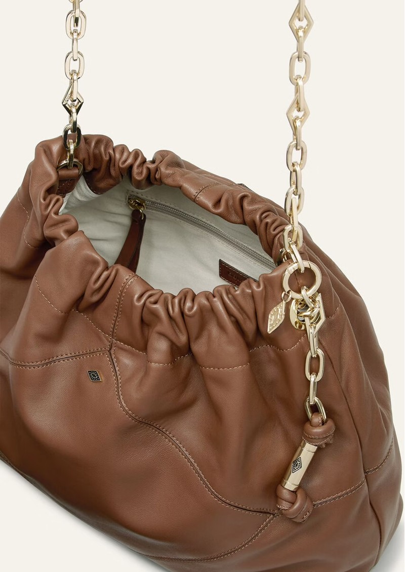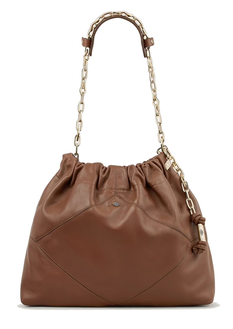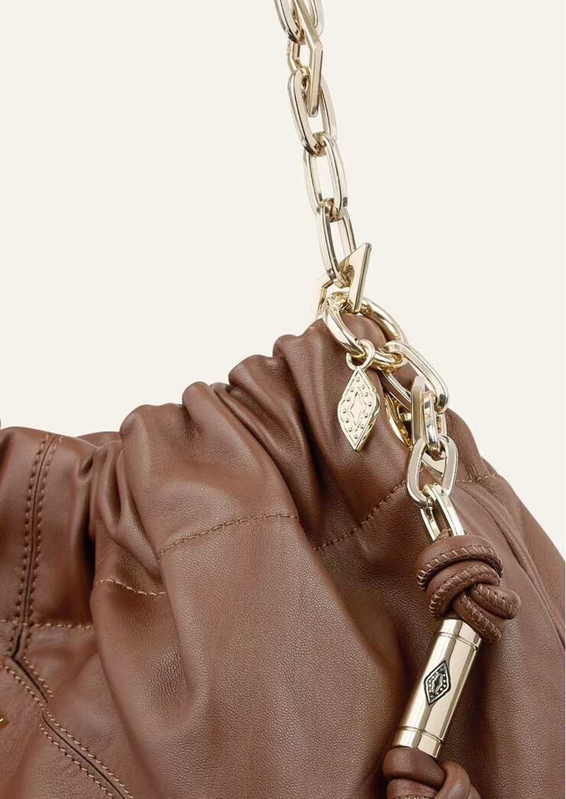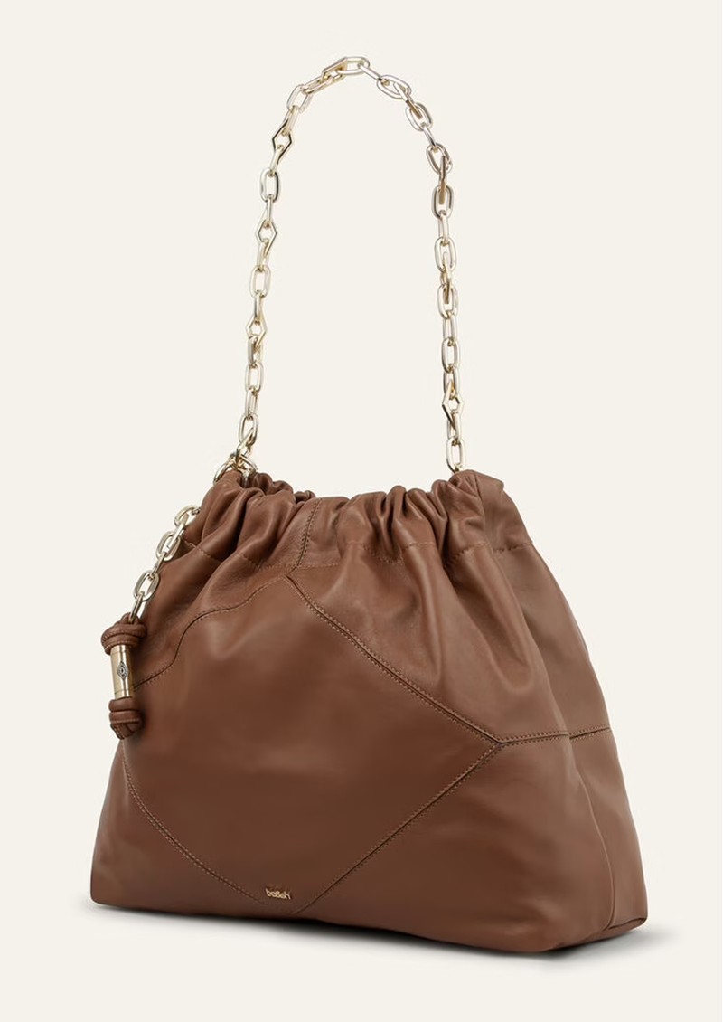 Introducing the Ba&Sh Leather June Tote. Crafted from a buttery soft leather fabrication, this Marron brown hued bag has gathered detailing at the top with metal tubes with the brands logo embossed. This bag also features diamond design metal chain, hand woven ties and can be carried by hand, shoulder and cross body making us super versatile. Other key features of this Ba&Sh bag include: