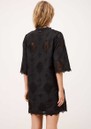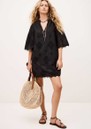 The Ba&sh Malo Mini Dress in Black is a chic, feminine piece featuring delicate broderie anglaise and a flattering mini length. It has flared elbow sleeves, a round neck with a subtle V-shaped slit, scalloped edges, and a fully lined design for comfort and style.