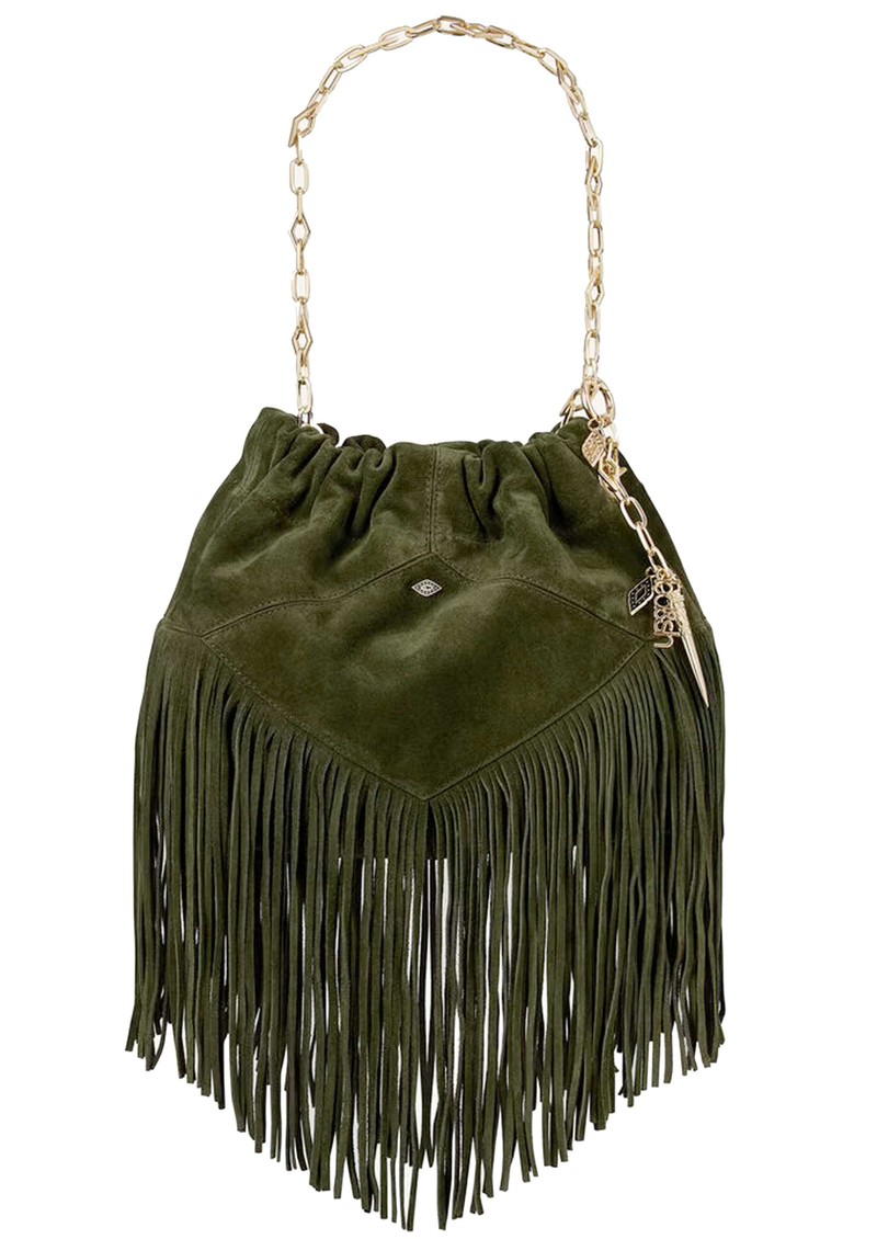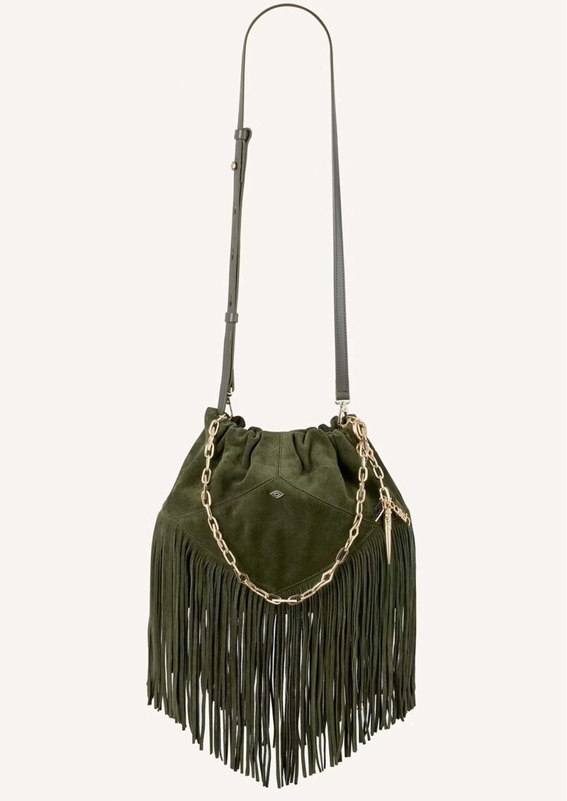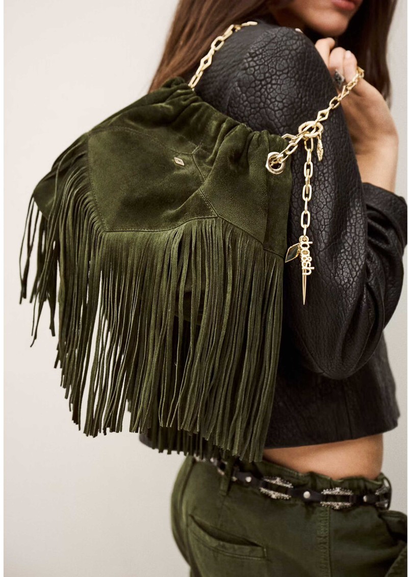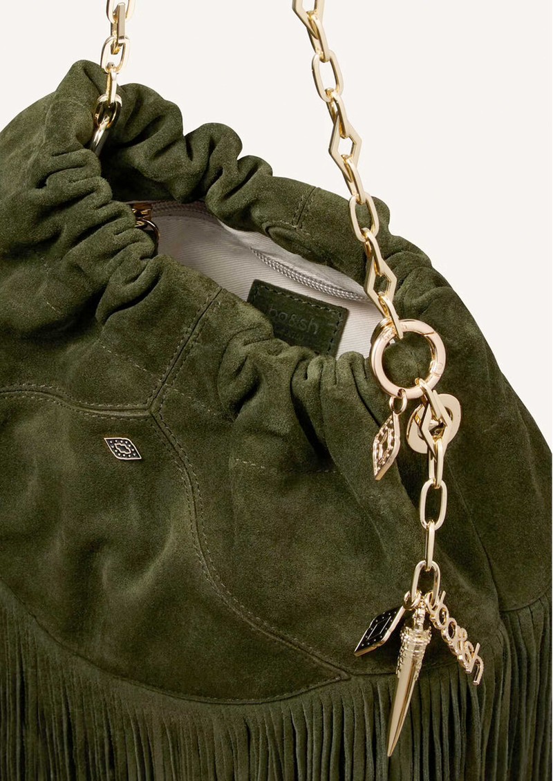 The Ba&sh Mini June fringed bag is crafted from soft green suede leather, featuring subtle Ba&sh metal detailing and gold-toned hardware. Designed for versatility, it offers two carry options: a chic gold link chain handle or a longer adjustable strap.