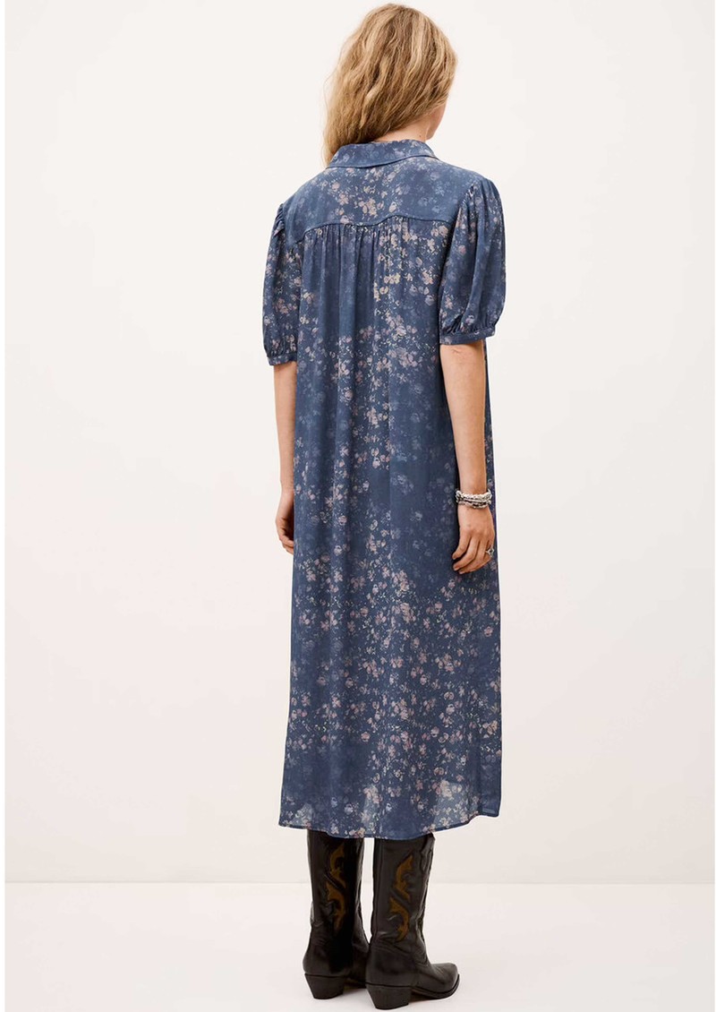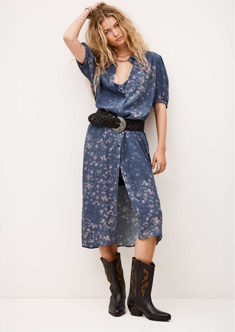 The Ba&sh Norma Dress in bleu is a lightweight, shirt-style dress crafted from soft viscose for an easy, relaxed feel. Featuring a classic collar, central button closure, short sleeves, and an all-over abstract floral print, this midi-length dress combines effortless style with a flattering, breezy silhouette.