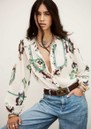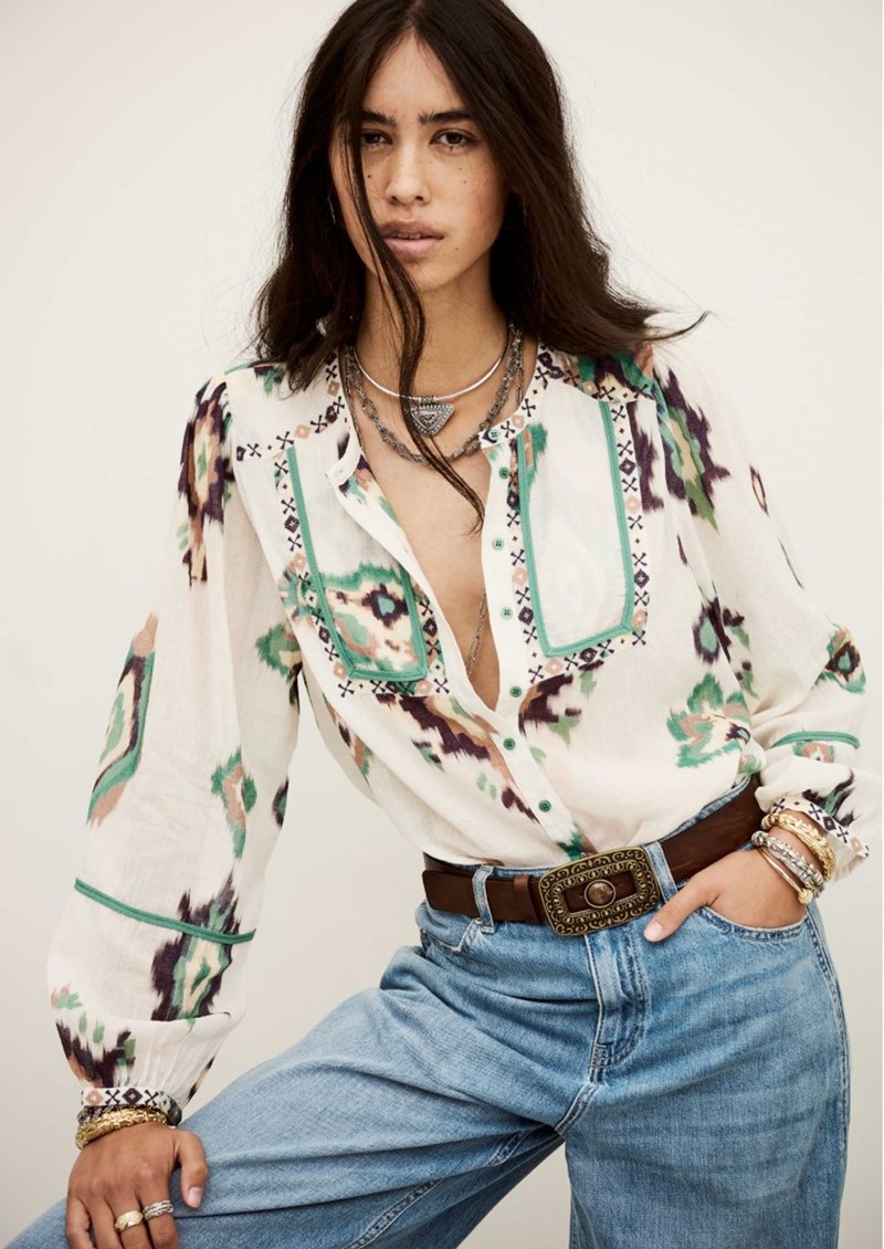 The Ba&sh Odelie Top features an ecru base with an ikat-style print in green and purple hues, a rounded neckline with a V-shaped cutout, central button closure, and voluminous full-length sleeves with narrow wrist cuffs for a relaxed, elegant silhouette.