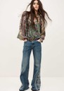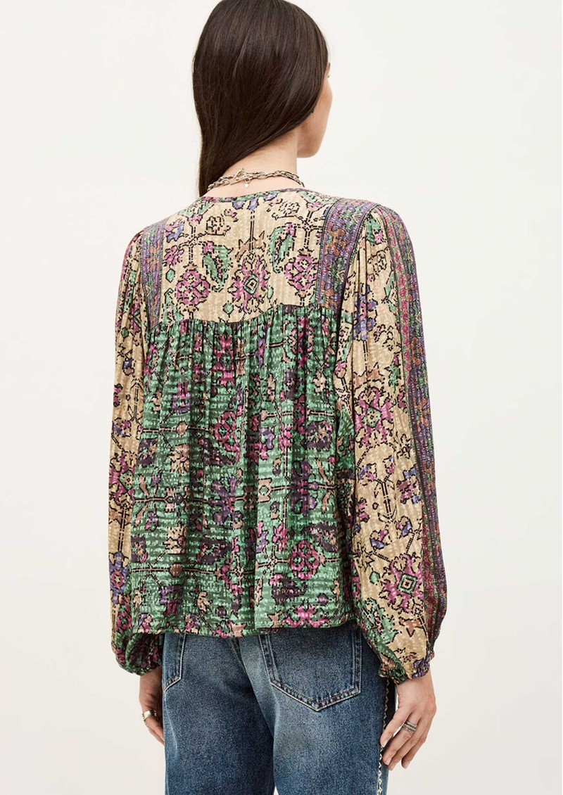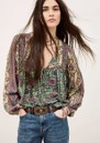 The Ba&sh Pamila Blouse in Vert is crafted from sustainable viscose, featuring a V-neck with two fastening ties, large sleeves with elasticated cuffs, and all-over fringing for a playful, bohemian-inspired look.