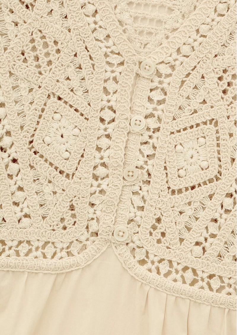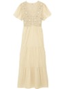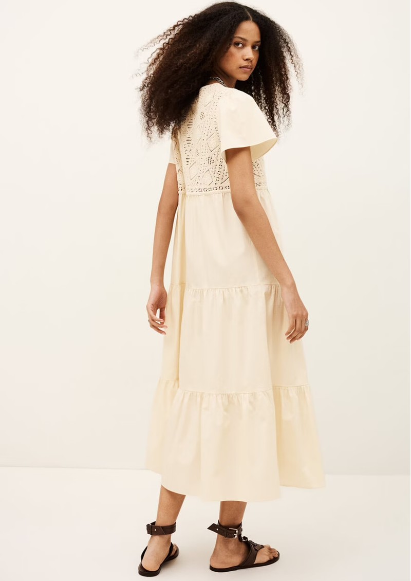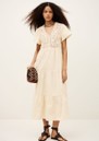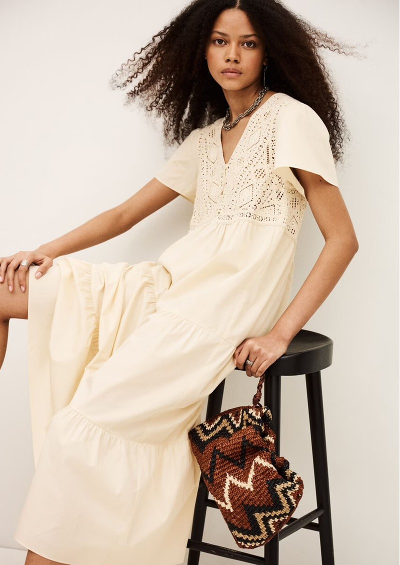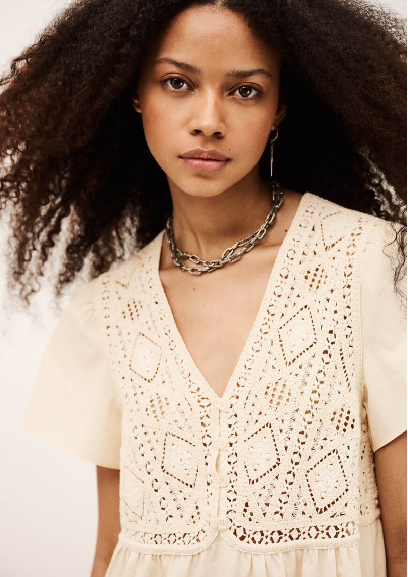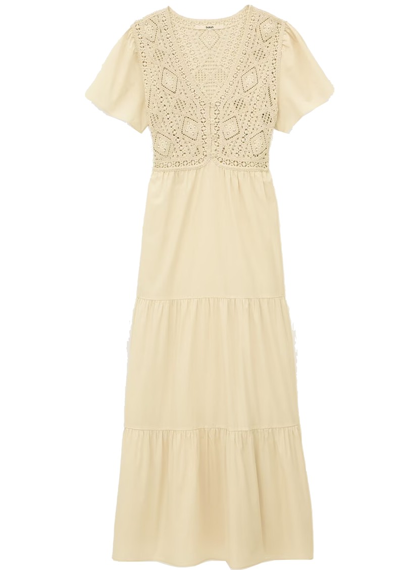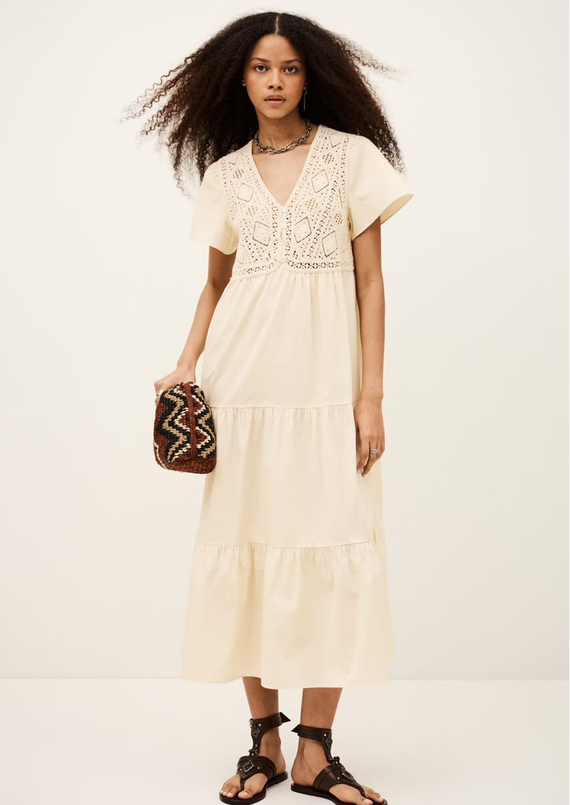 The Ba&sh Sandy dress in ecru is a romantic cotton piece elevated with intricate guipure lace detailing at the front and back yoke for a delicate, feminine finish. Designed with a flattering V-neckline, button-through front fastening and tiered skirt with soft frill layers, it has an airy, flowing silhouette and is fully lined for ease of wear.