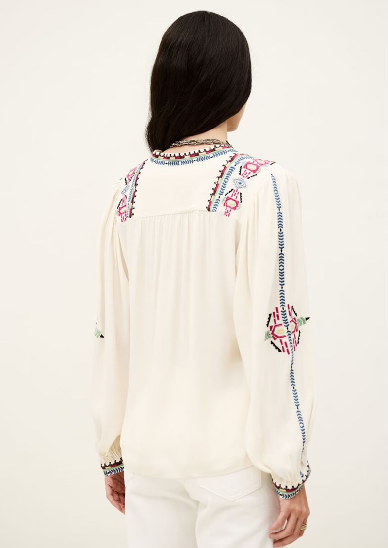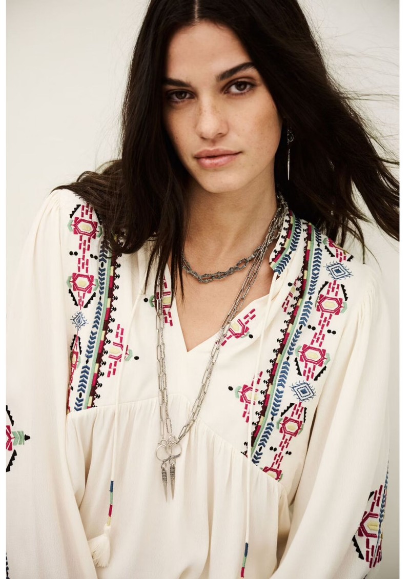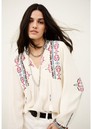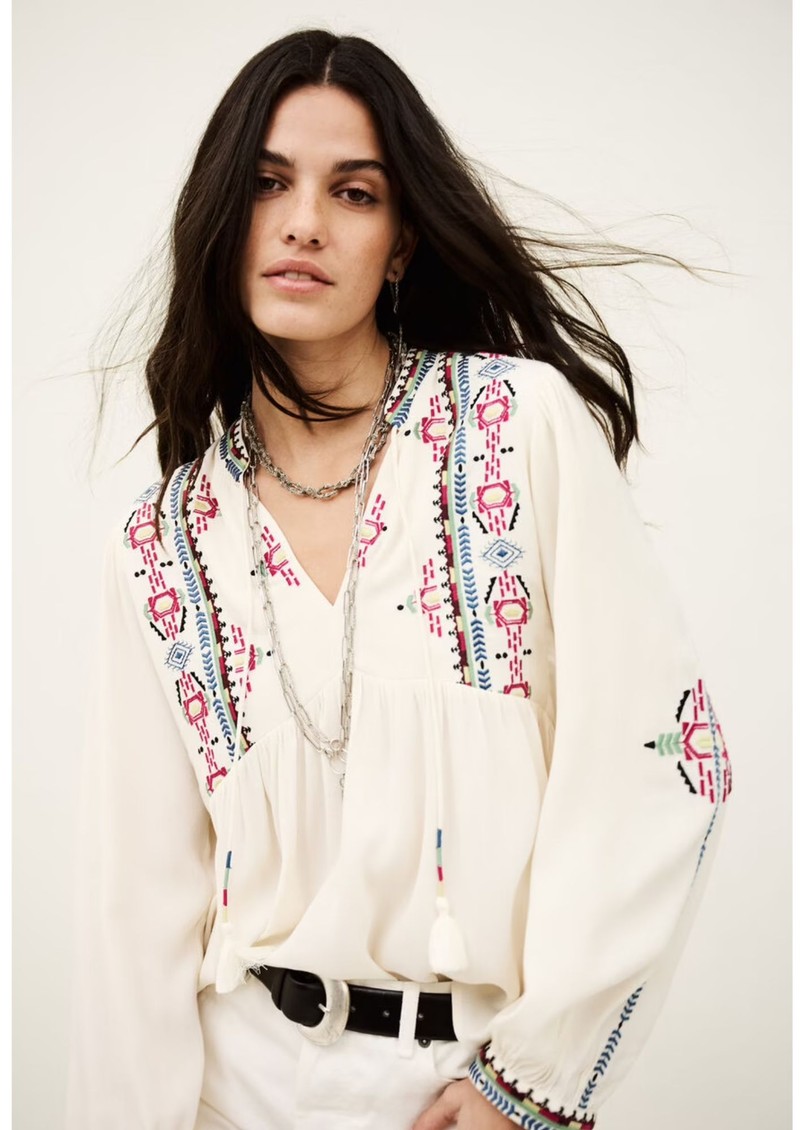 Introducing the Tilt blouse from Ba&sh. Designed in a soft airy ecru fabric with intricate embroidered detailing with voluminous sleeves this is a blouse that captures effortless bohemian elegance with a modern edge.