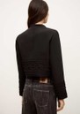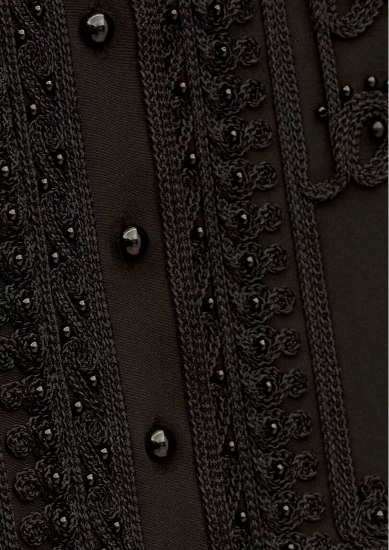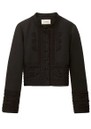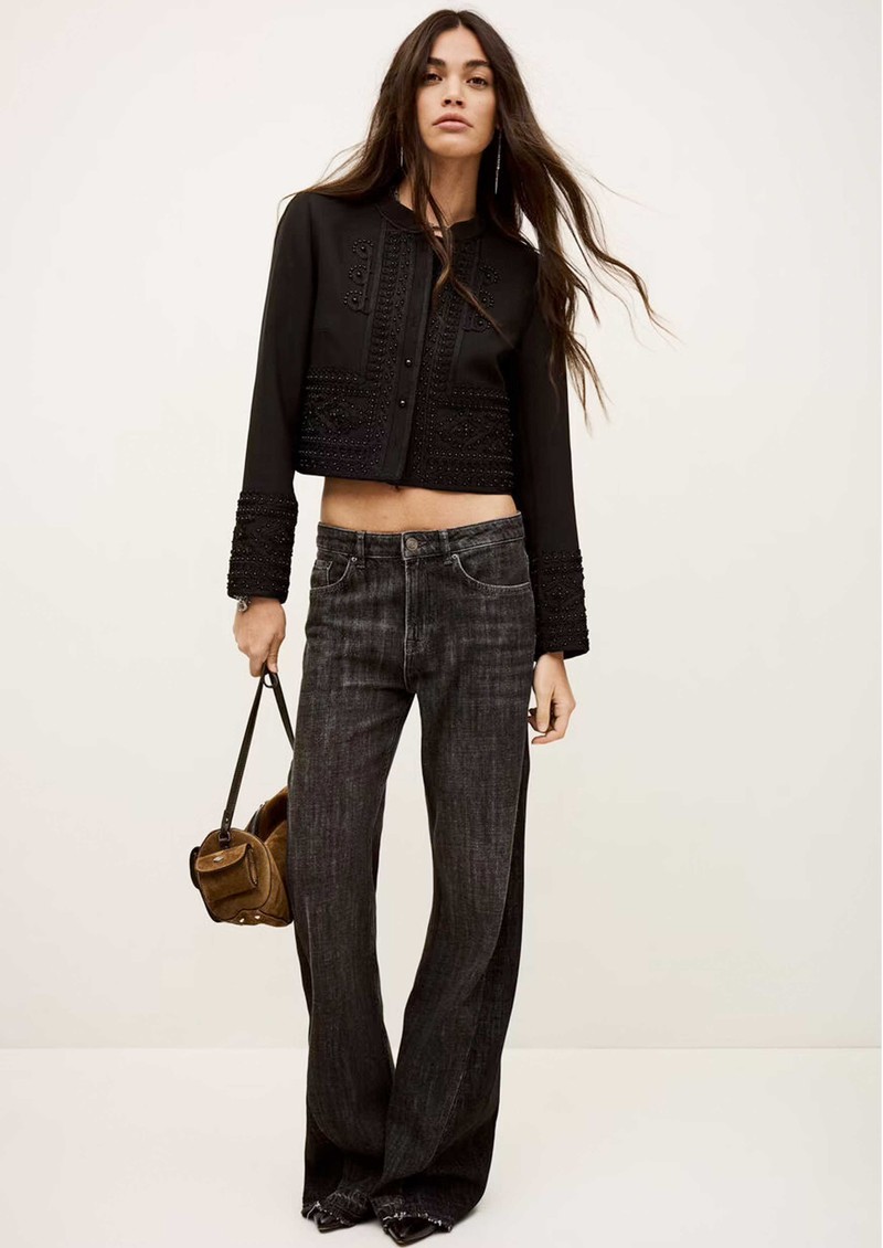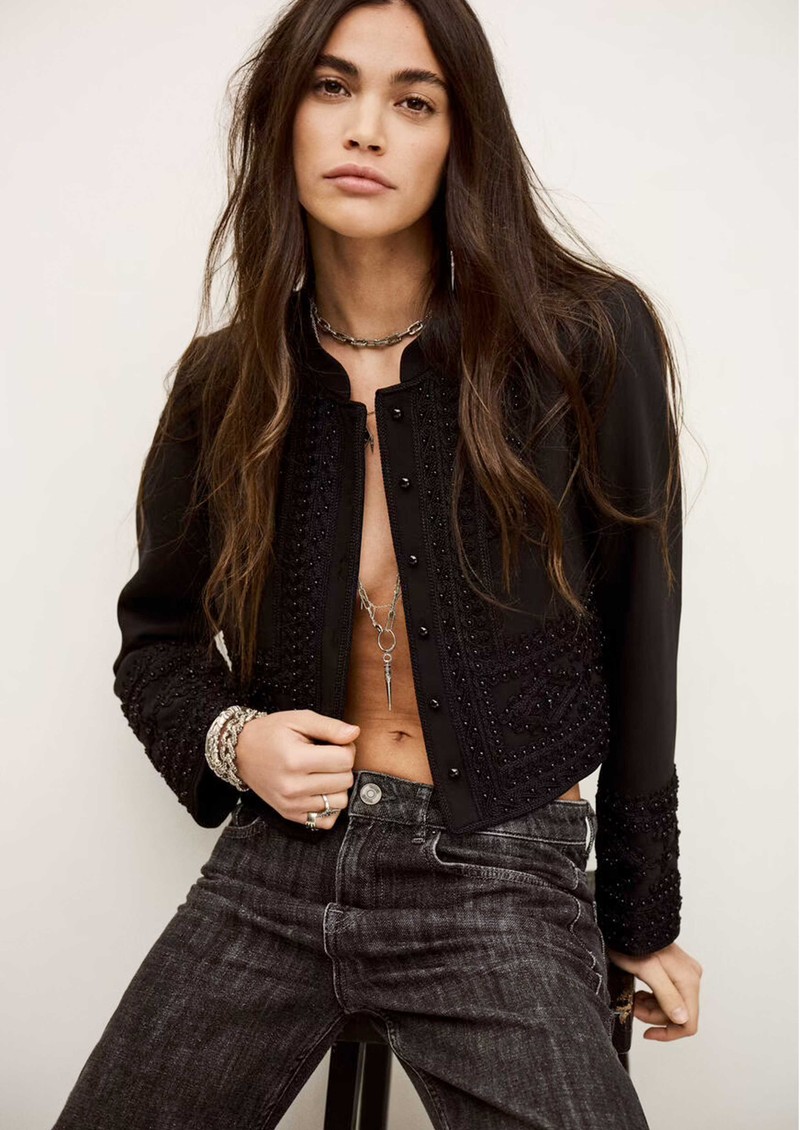 The Ba&sh Tolosa Jacket is a chic, short suit-style jacket crafted from 97% recycled polyester and 3% elastane, combining sustainability with modern sophistication. Featuring a high neck, long sleeves, and a straight cut, it’s adorned with embroidered and beaded details and finished with shoulder pads for a polished, structured look.