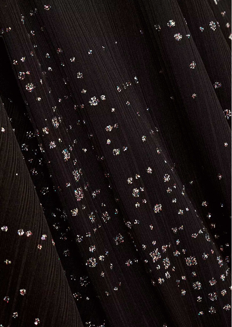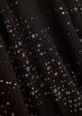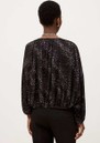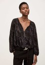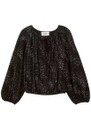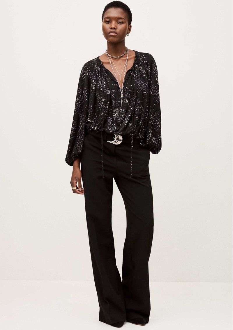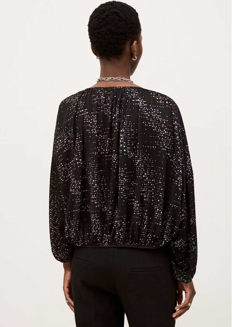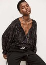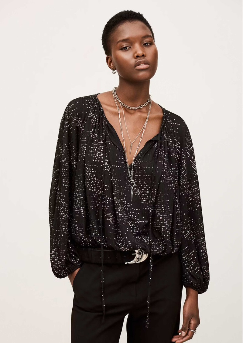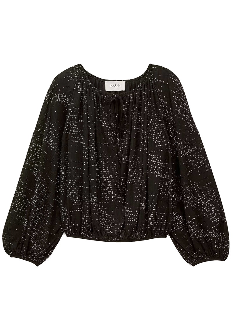 The Ba&sh Torny Peasant Blouse in black is an oversized jersey top, crafted from a recycled polyester blend, featuring sequinned details, a lightly striped pattern, batwing sleeves, and a gathered hem for a relaxed, evening-ready silhouette.