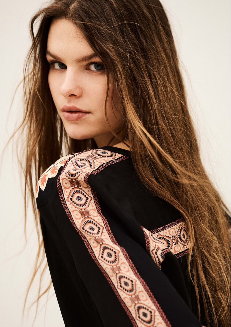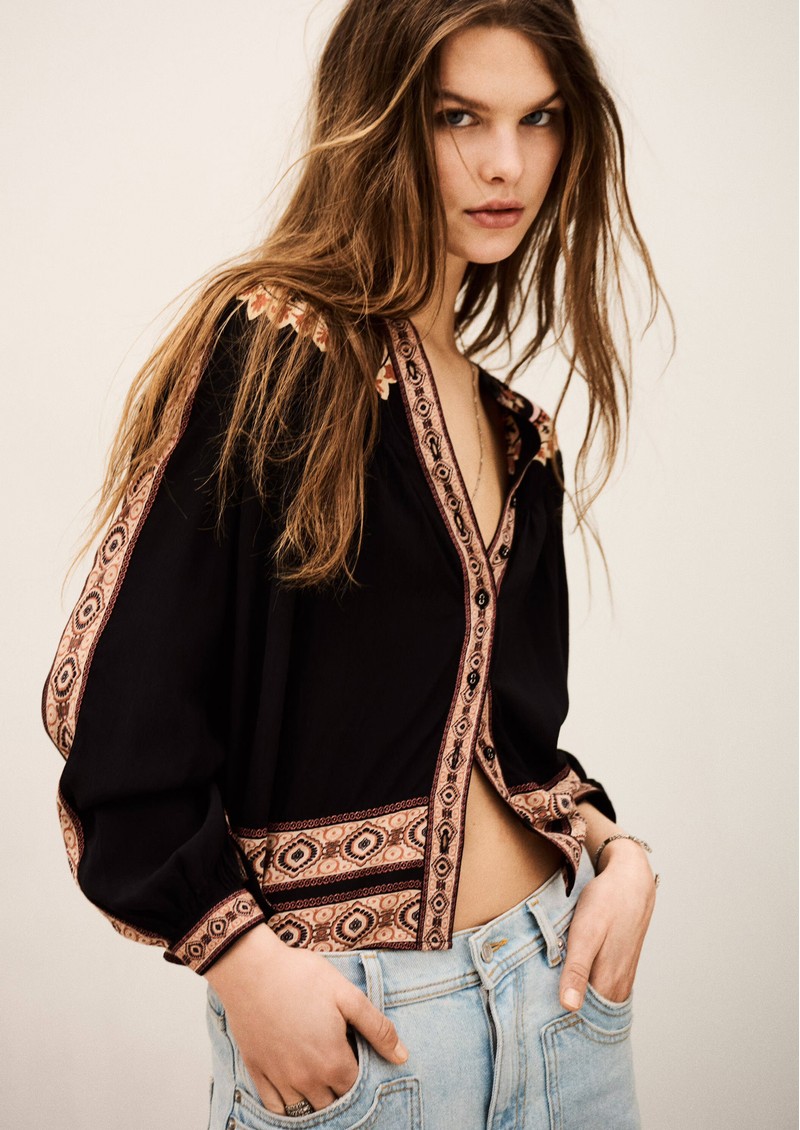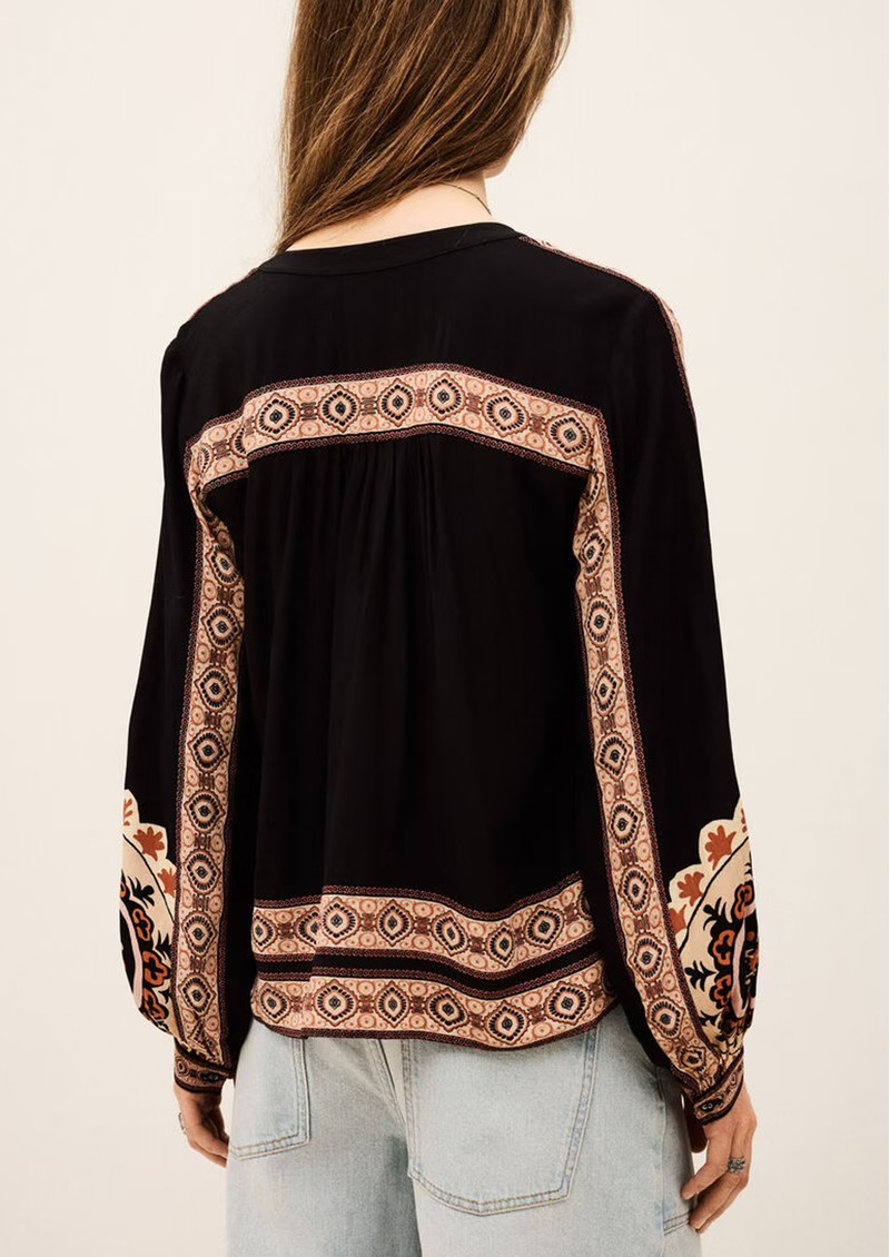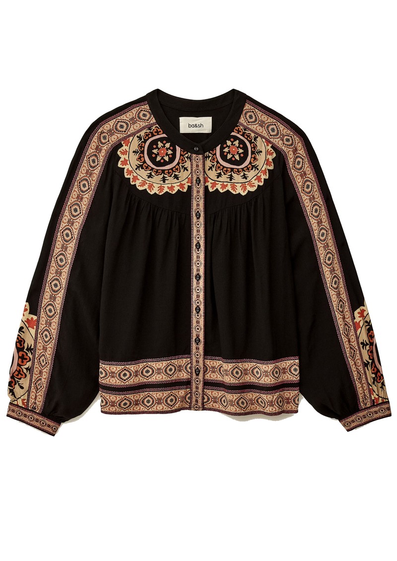 Introducing the Valda blouse from Ba&sh, a gorgeous long sleeve printed blouse with a unique rosette and patterned strips print. This relaxed fit top has a buttoned down placket enabling you wear buttoned up or open. Other features include: