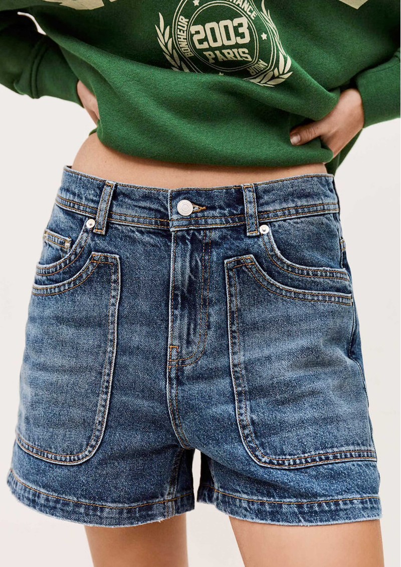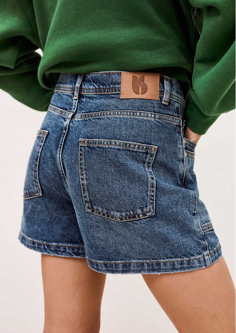 The Ba&sh Zevy Denim Shorts in Blue Jeans are a stylish and sustainable wardrobe staple, crafted from 100% organic cotton. They feature double front pockets, large patch pockets at the back, a fly zip, and belt loops for a classic, practical design.