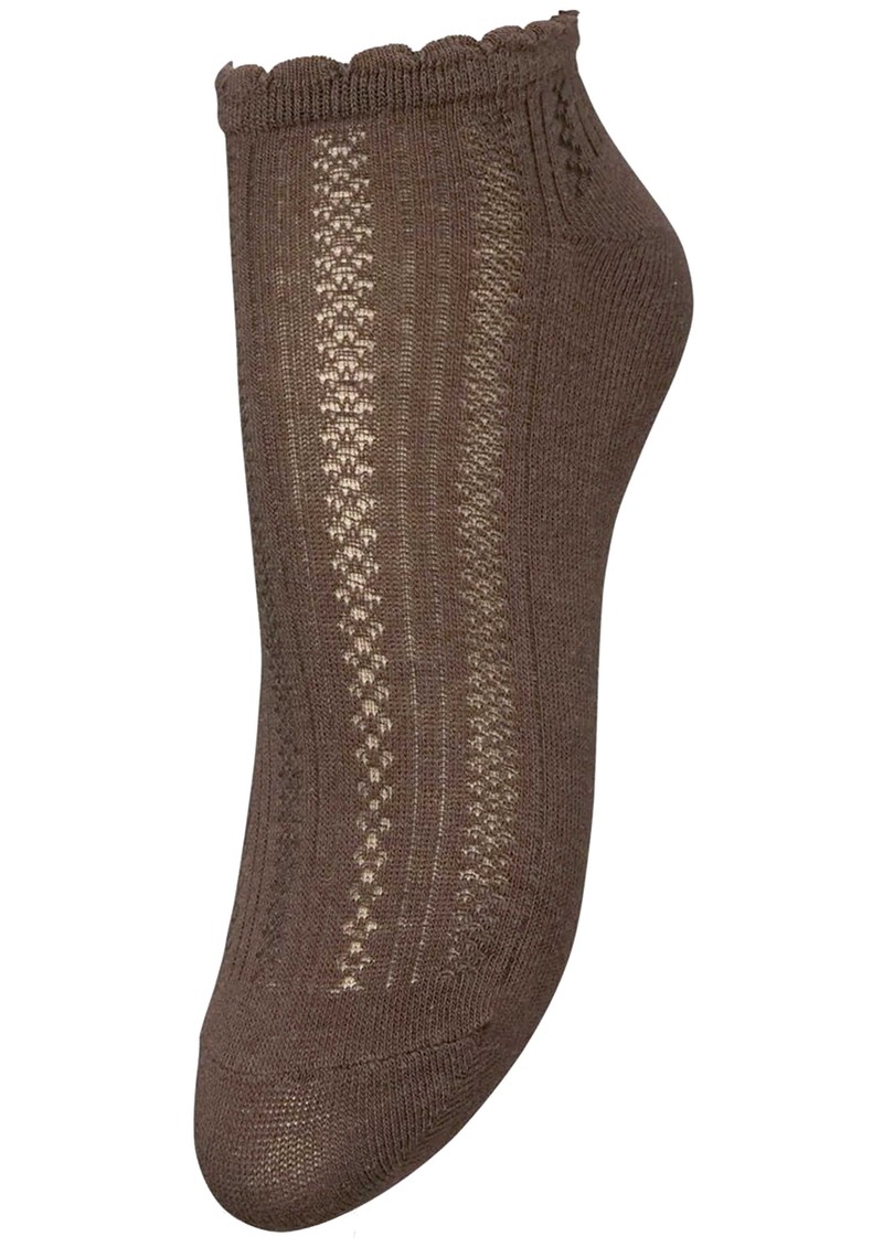 The Becksondergaard Crochia Cotta Sock in hot fudge is an ankle-length sock that combines comfort with a feminine, stylish touch. Made from a soft cotton blend, it features a delicate semi-sheer hole pattern and a scalloped edge, making it perfect for elevating everyday outfits.