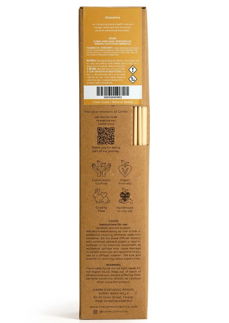 The Cahm Atacama Reed Diffuser fills your home with a zesty, woody summer fragrance of lime, orange, cedarwood, and amber, creating a tranquil oasis for citrus-and-woods lovers. Hand-poured with sustainably sourced reeds and bunny tails in a clear glass bottle, it combines long-lasting fragrance with eco-friendly, vegan, and plastic-free packaging.