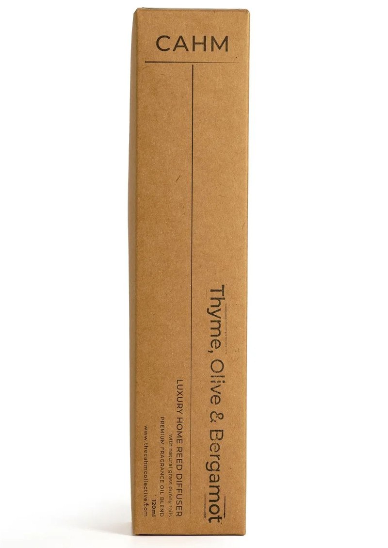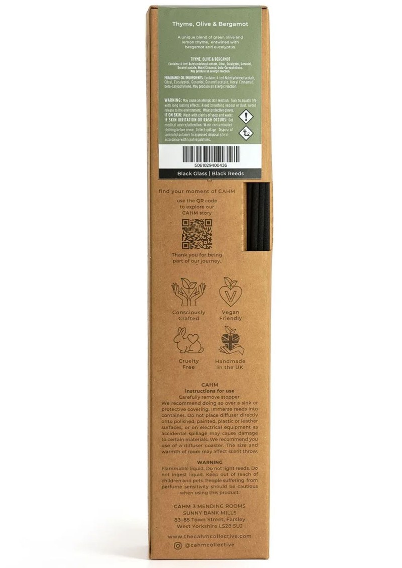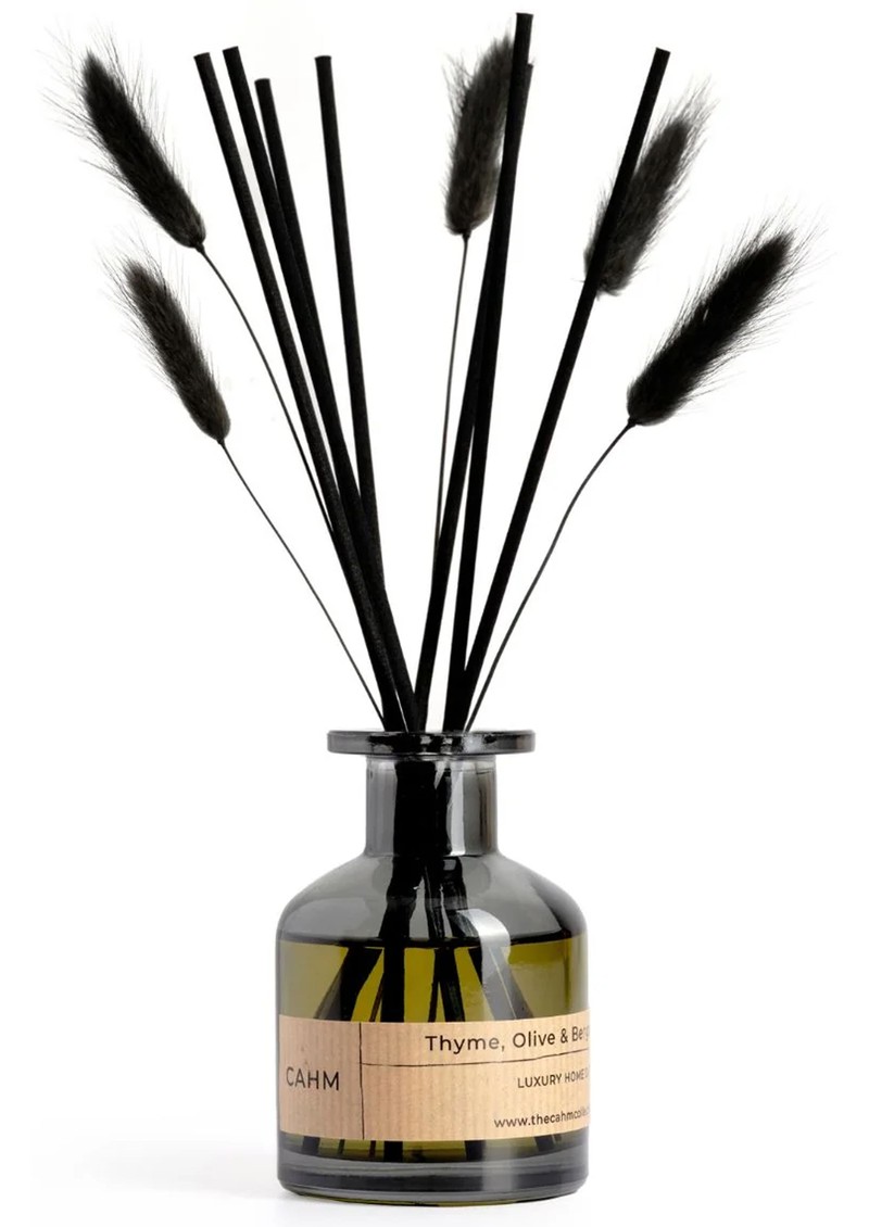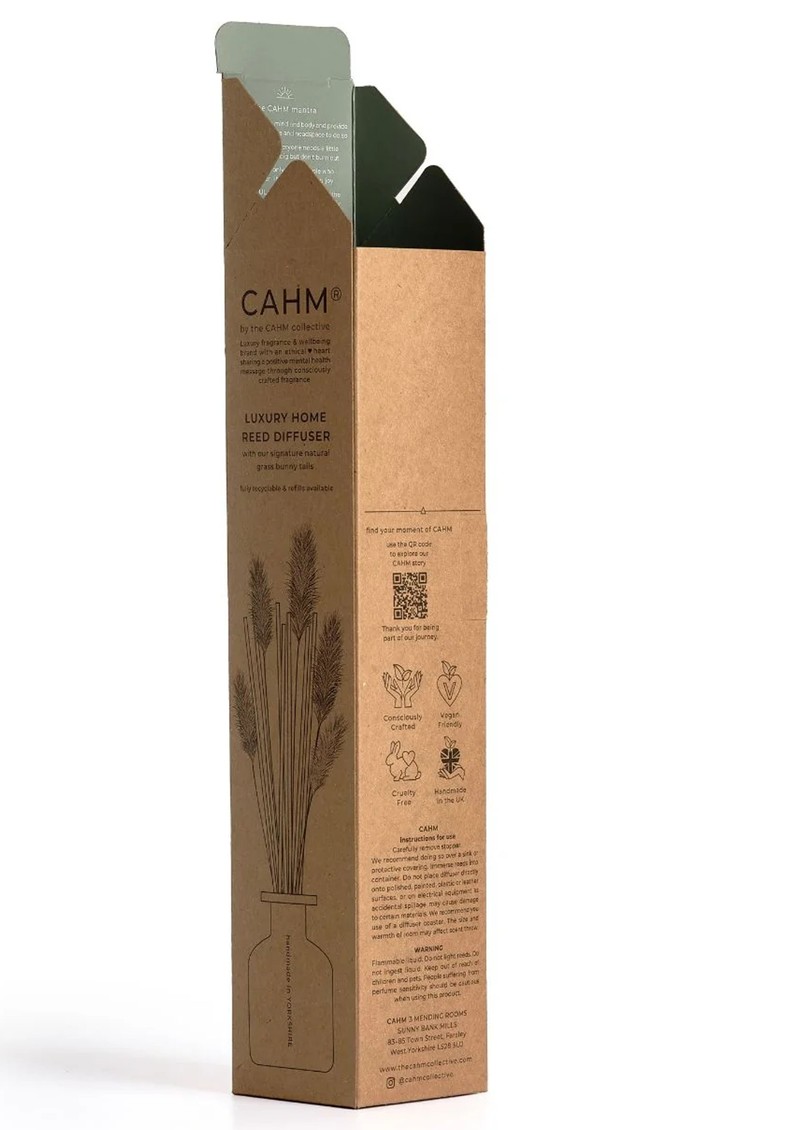 This Cahm Reed Diffuser is hand-poured in Yorkshire using premium fragrance oils, natural lagurus grass reeds, a reusable glass bottle, and sustainably sourced, vegan-friendly packaging.