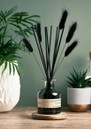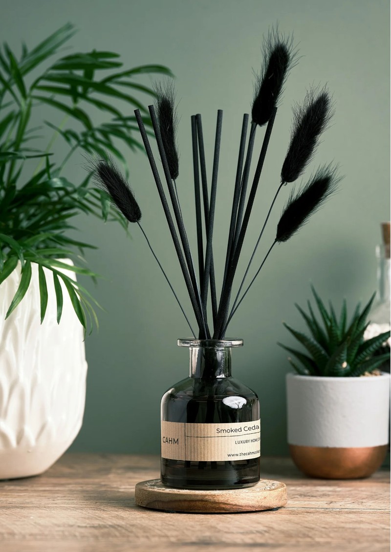 This Cahm Reed Diffuser is hand-poured in Yorkshire using premium fragrance oils, natural lagurus grass reeds, a reusable black glass bottle, and sustainably sourced, vegan-friendly packaging.
