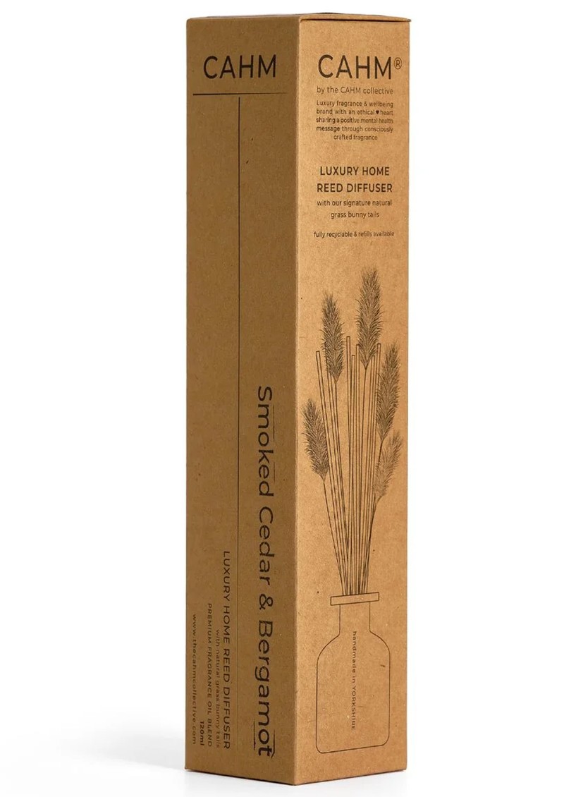 The Cahm Smoked Cedar & Bergamot Reed Diffuser fills your home with a warm, woody blend of cedarwood and bergamot, creating a calm, cosy atmosphere that helps you focus and be present. Hand-poured in Yorkshire and finished with sustainably sourced lagurus grass, it combines style with mindful, long-lasting fragrance.