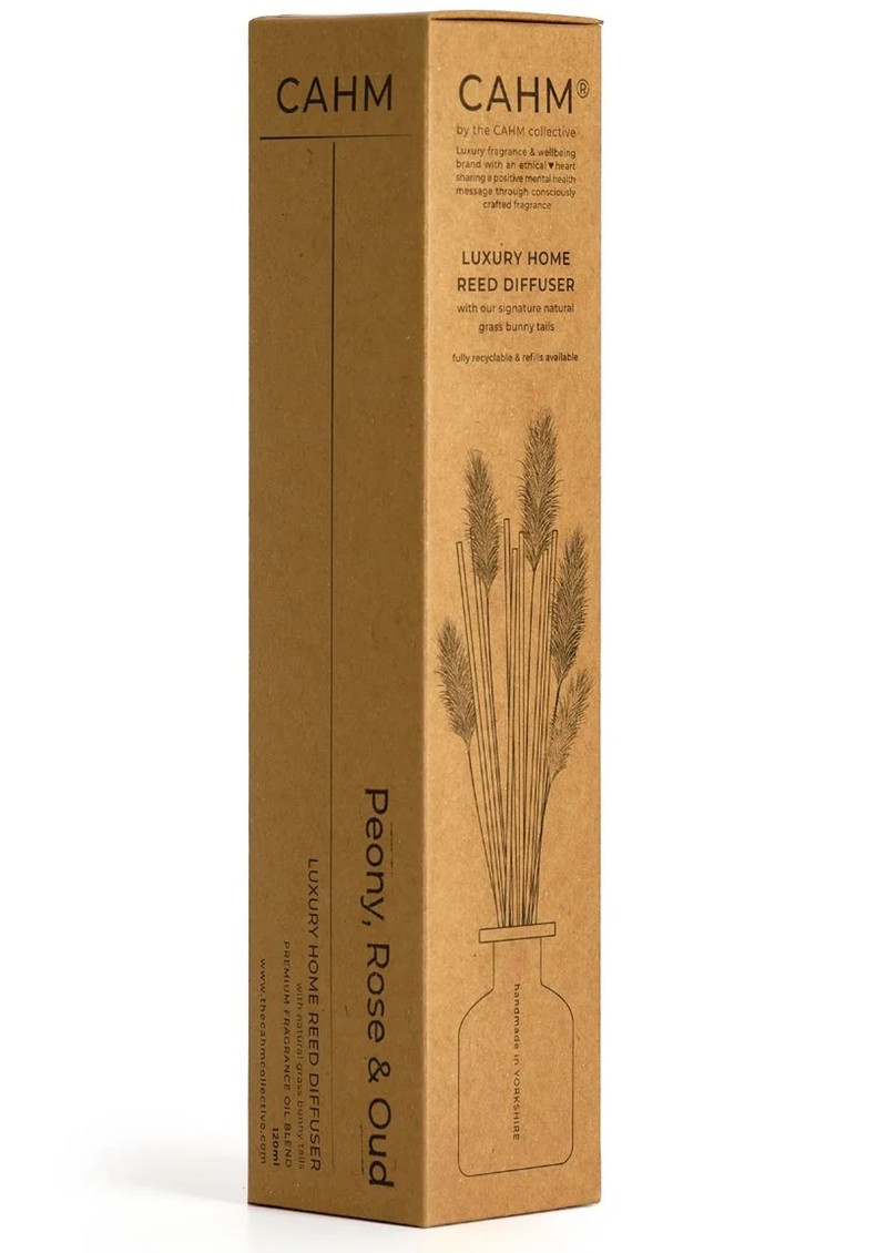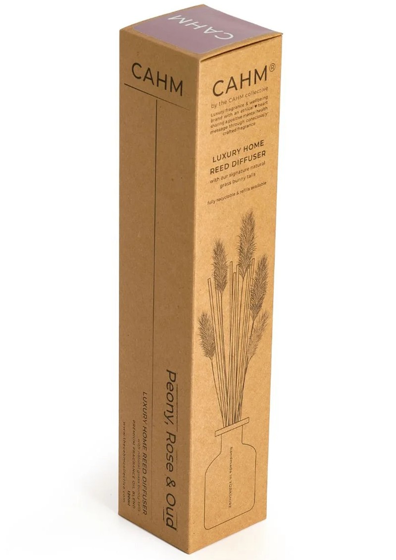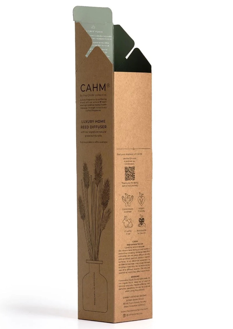 This Cahm Reed Diffuser is hand-poured in Yorkshire using premium fragrance oils, natural lagurus grass reeds, a reusable glass bottle, and sustainably sourced, vegan-friendly packaging.