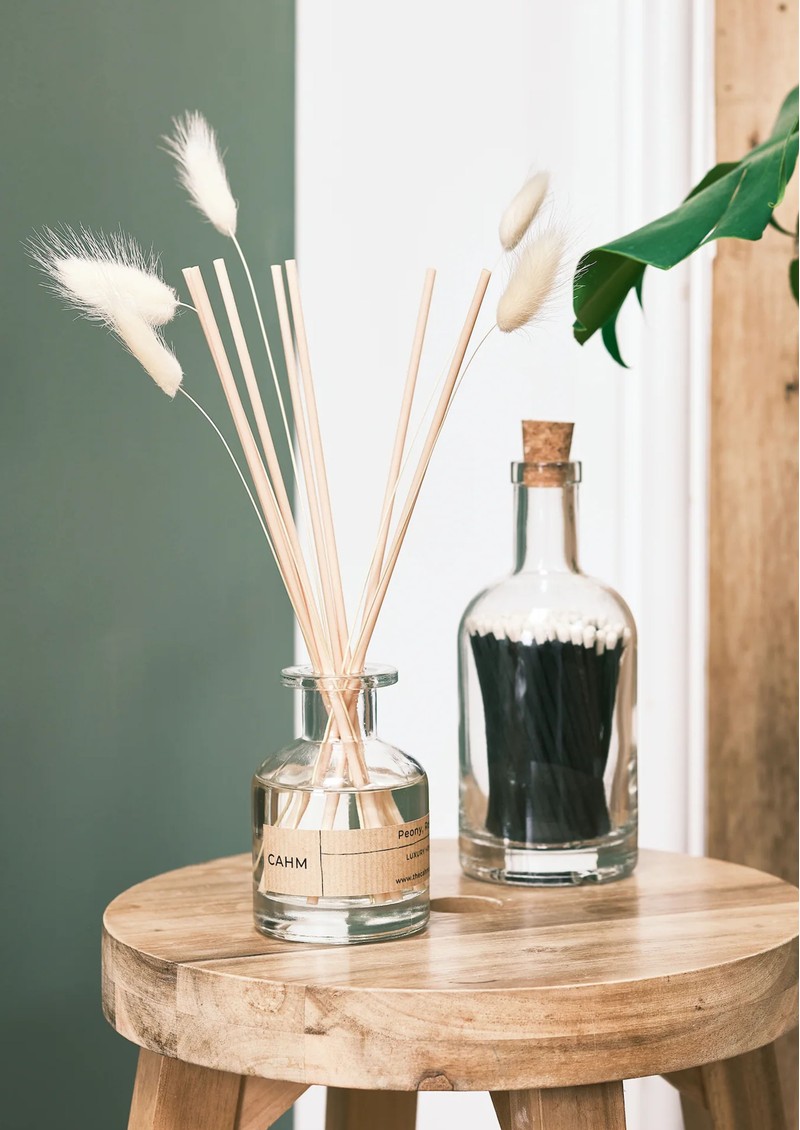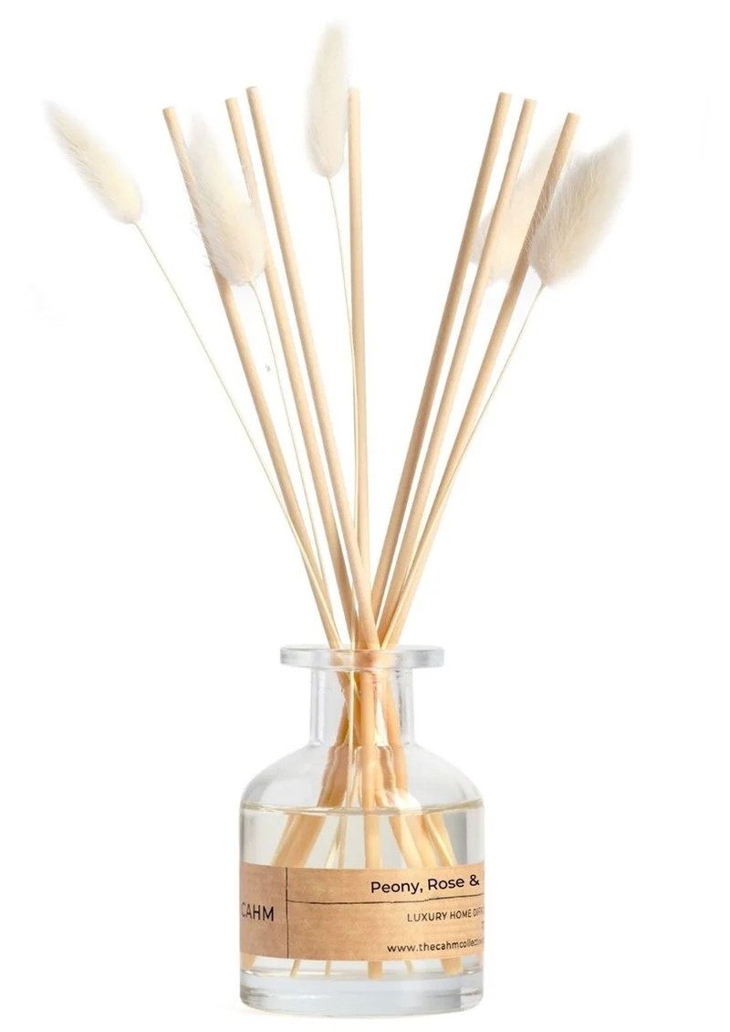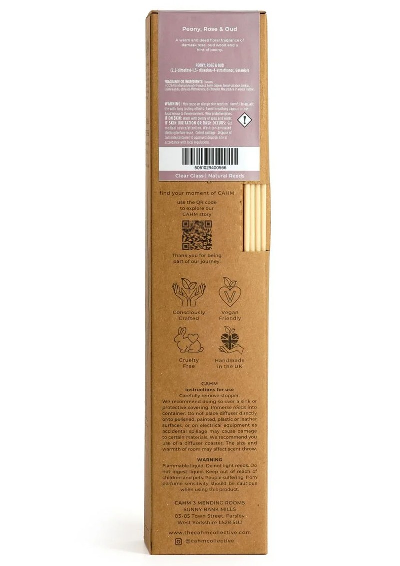 The Cahm Peony, Rose & Oud Reed Diffuser fills your home with a rich, warm floral scent of damask rose, oud, and a hint of peony, creating a calming and cosy atmosphere that encourages focus, deep breathing, and presence. Hand-poured with sustainably sourced reeds and bunny tails in a clear glass bottle containing 120ml of premium fragrance oils, it’s a stylish home accessory that delights both the eyes and the senses.