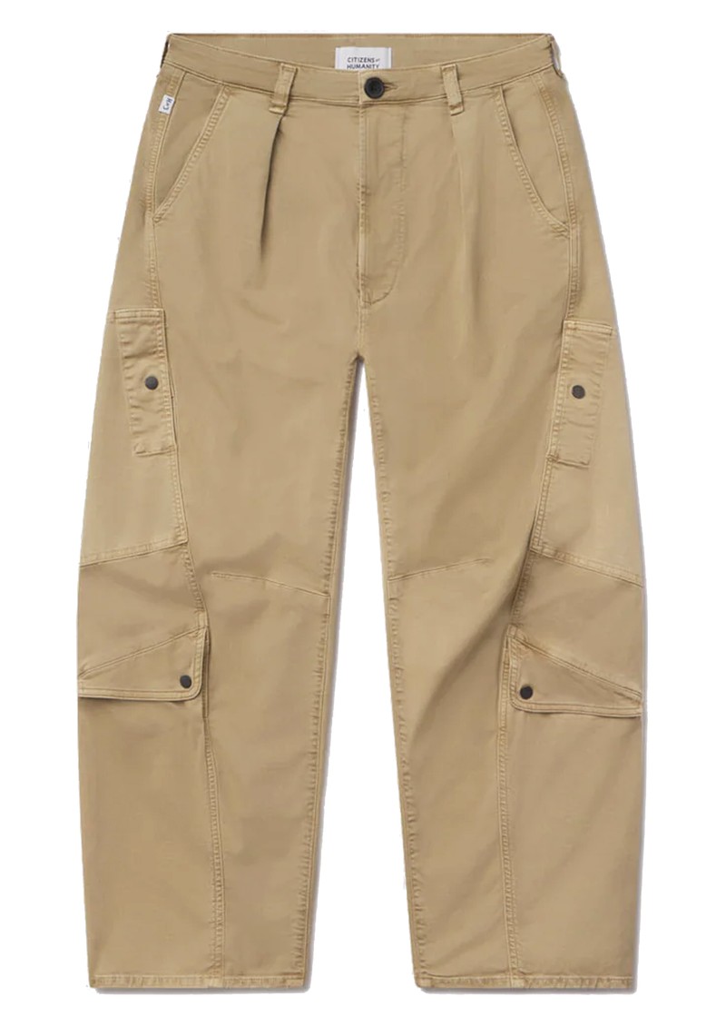 The Citizens of Humanity utility pant offers a vintage-inspired fit with a pleated waist and barrel-leg silhouette, combining style and comfort for a timeless look. Crafted from midweight, breathable stretch twill in Catalina beige wash, it features side pockets and pleat detailing, giving a soft, vintage feel perfect for everyday wear.