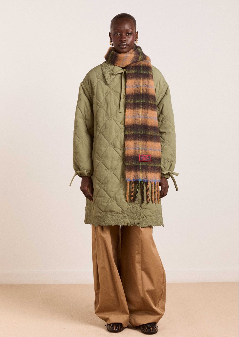 The Damson Madder Avery Quilted Coat in Olive blends cosy all-over quilting with charming embroidered details for an elevated everyday layer. Practical pockets, cuff ties, and a flattering midi length make it a go-to piece for style and comfort.