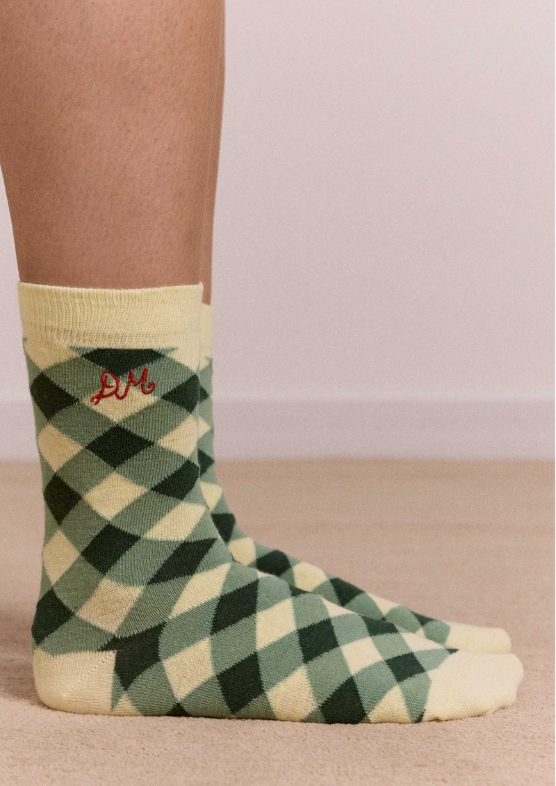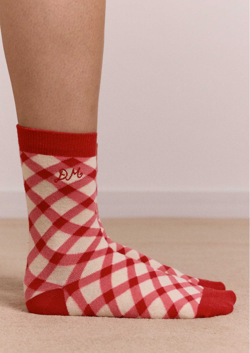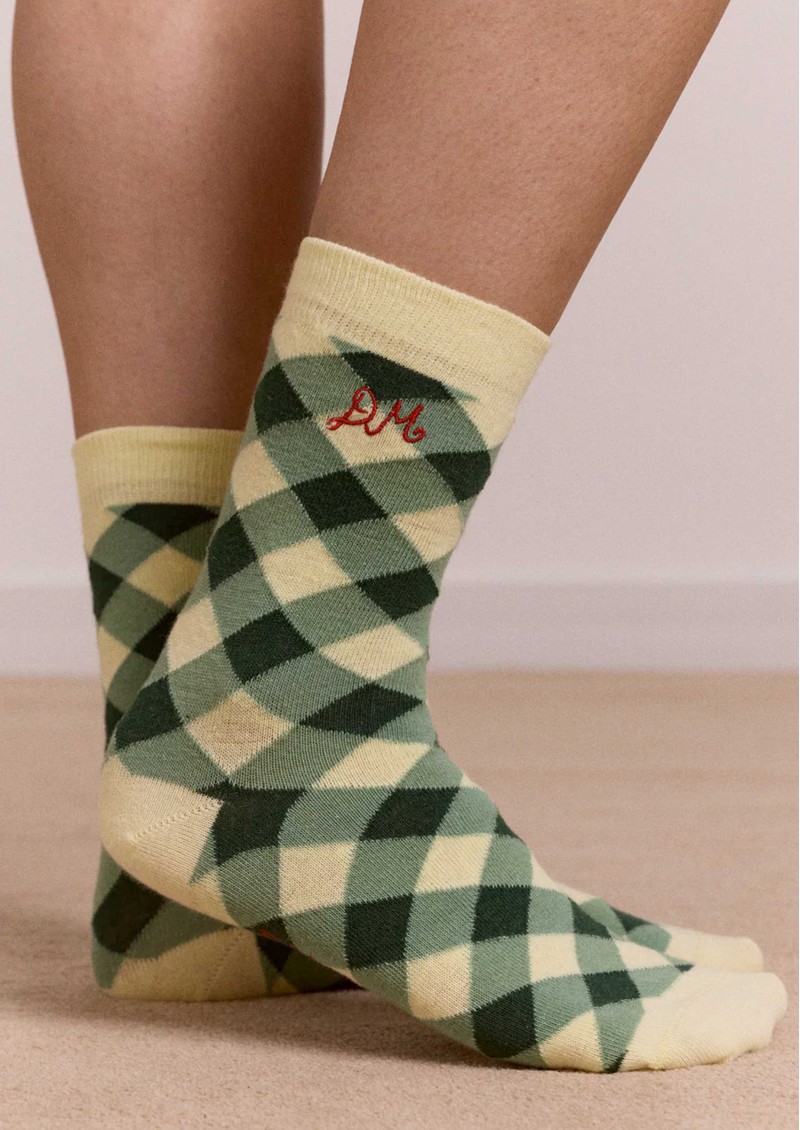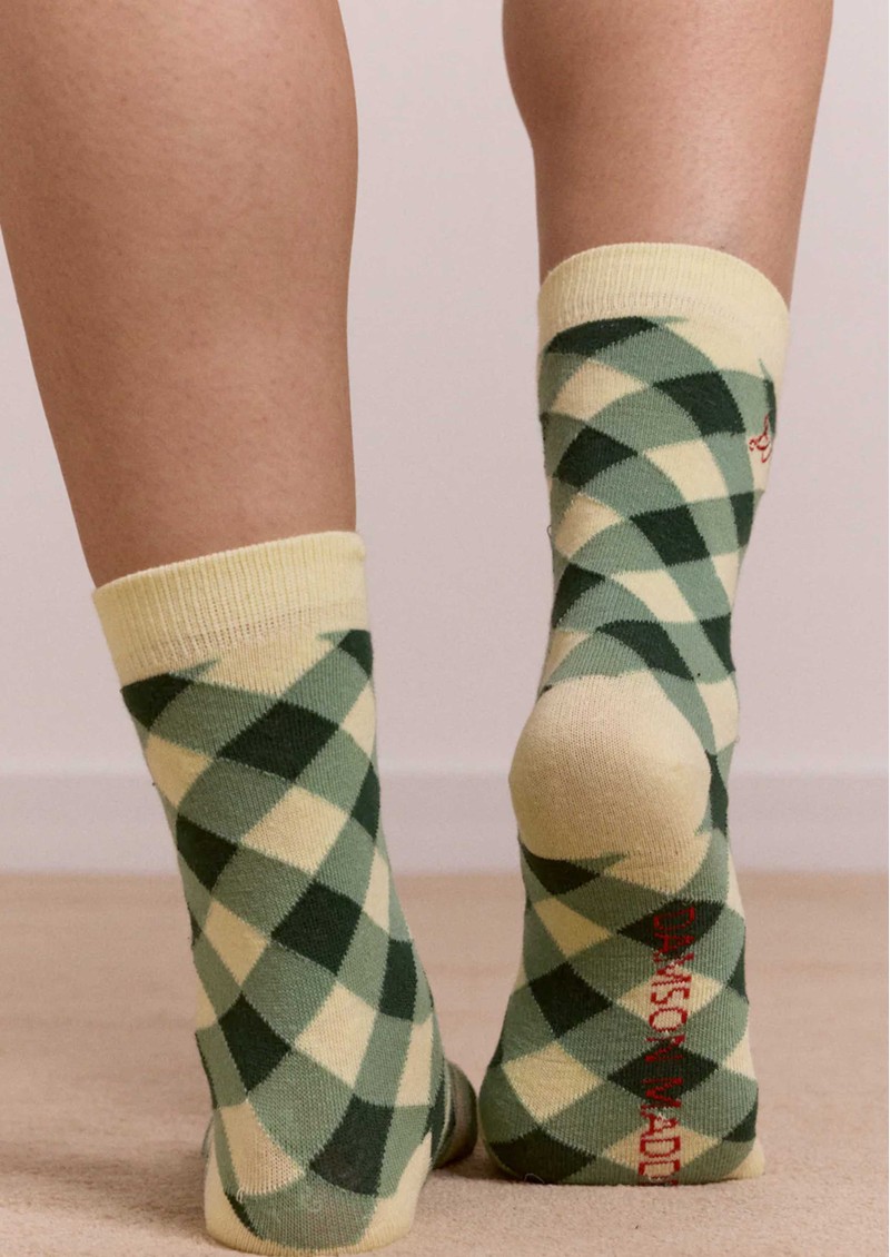 The Damson Madder Calf 2-Pack Gingham Socks feature a playful mix of green and yellow gingham and red and ecru windowpane check, finished with subtle DM embroidery for a signature touch. Perfect for adding a fun pop of pattern to any outfit, these calf-length socks are a stylish, eco-conscious accessory.