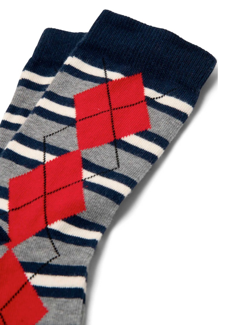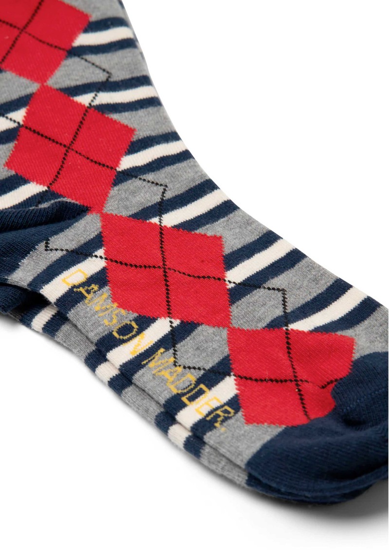 The Damson Madder Calf Length Socks feature a classic navy and grey argyle stripe, combining timeless style with everyday comfort. Made from a soft organic cotton blend with recycled nylon and elastane, they offer durability, stretch, and a gentle feel against the skin, finished with the signature DM embroidery.