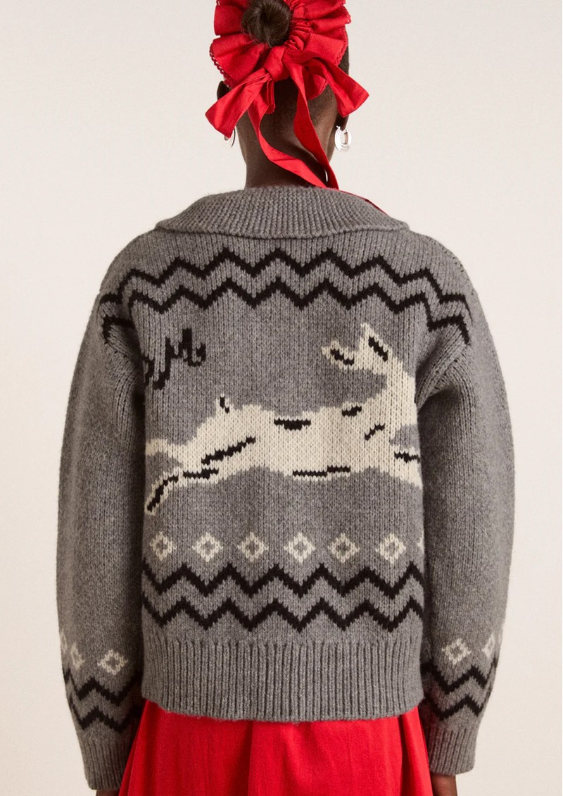 Cut in a contemporary boxy silhouette, the Damson Madder Cecily Cardigan combines playful sophistication with effortless wearability. Made from 100% RWS-certified lambswool, it features a Peter Pan collar, button-through front, and a whimsical bunny motif on the back, adding a touch of quiet eccentricity to any outfit.