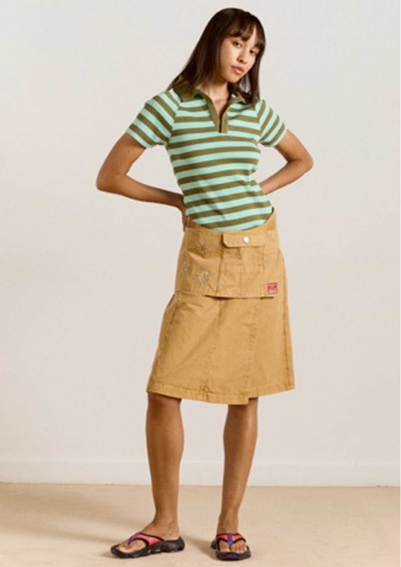 Classic and comfortable, the Damson Madder Delphi Ribbed Polo Top in Green is crafted from a sustainable organic cotton blend with a touch of stretch, featuring a pointed collar, short sleeves, and a close fit. Finished with a DM embroidered logo at the nape, it’s a timeless piece for effortless everyday style.